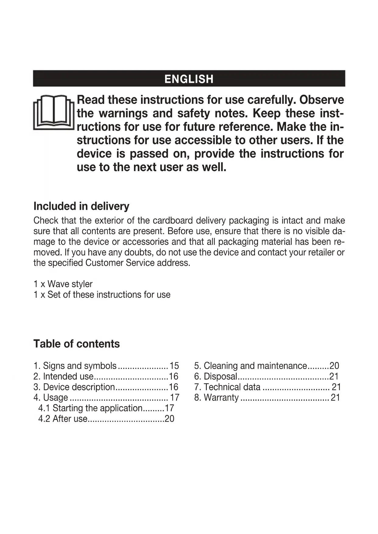 ructions for use for future reference. Make the in- structions for use accessible to other users. If the device is passed on, provide the instructions for use to the next user as well. Included in delivery Check that the exterior of the cardboard delivery packaging is intact and make sure that all contents are present. Before use, ensure that there is no visible da- mage to the device or accessories and that all packaging material has been re- moved. If you have any doubts, do not use the device and contact your retailer or the specified Customer Service address. 1 x Wave styler 1 x Set of these instructions for use