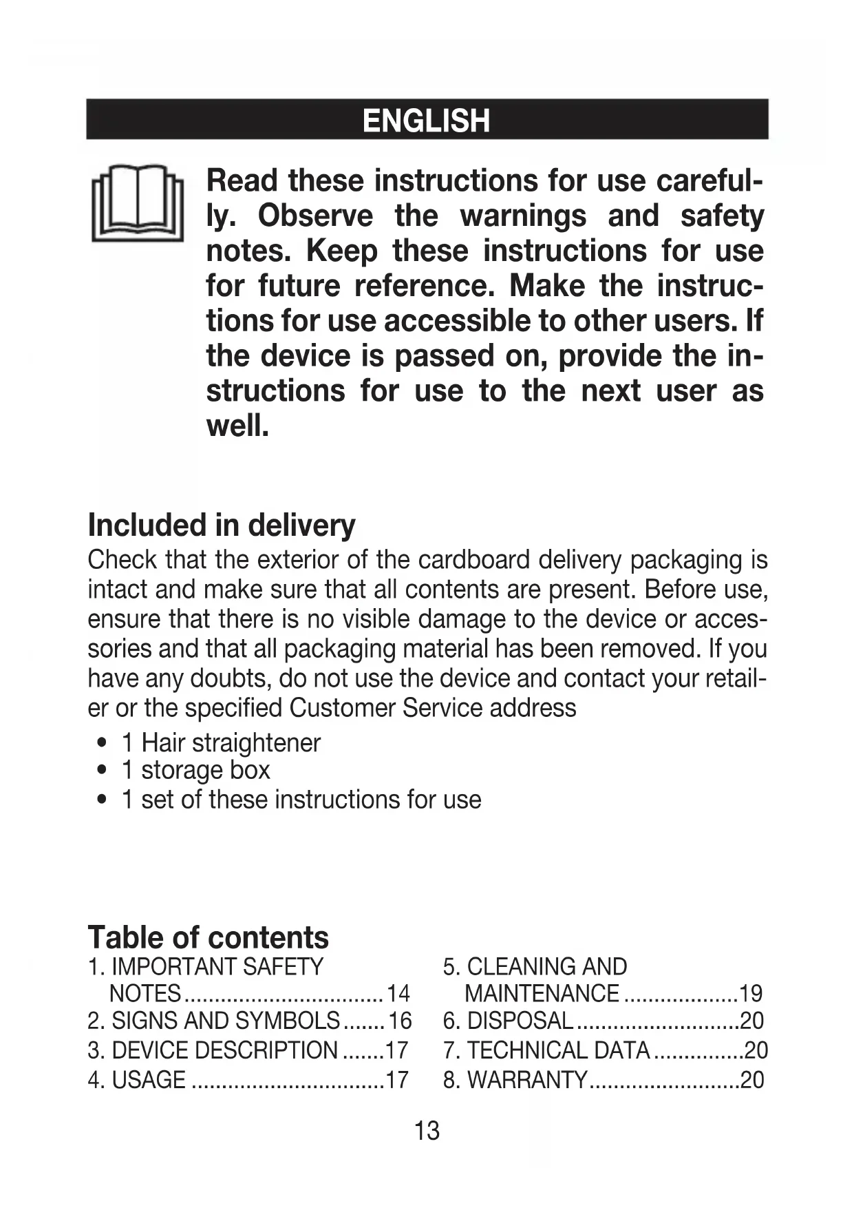 The Hair straightener must only be used for pri- vate use to straighten and style your own hair.16