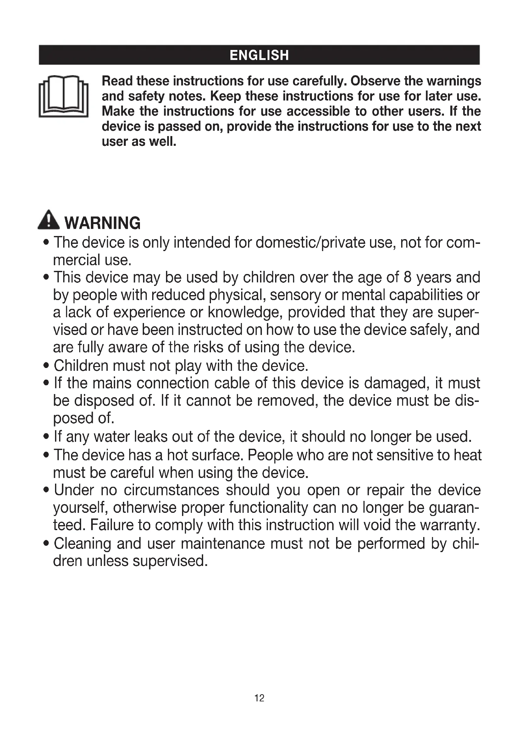 - The device has ahot surface. People who are not sensitive to heat must be careful when using the device.