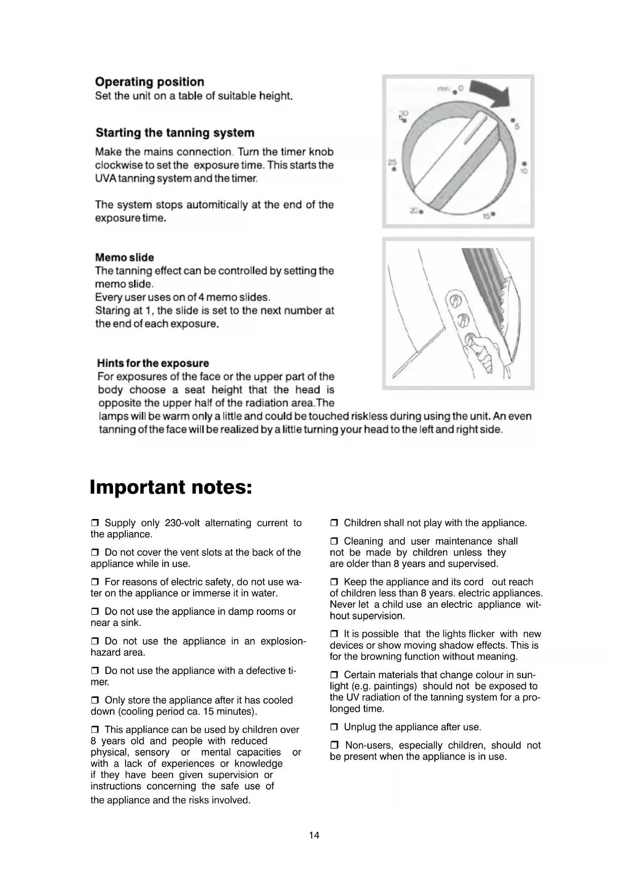 r Supply only 230-volt alternating current to the appliance. r Do not cover the vent slots at the back of the appliance while in use. r For reasons of electric safety, do not use wa- ter on the appliance or immerse it in water. r Do not use the appliance in damp rooms or near a sink. r Do not use the appliance in an explosion- hazard area. r Do not use the appliance with a defective ti- mer. r Only store the appliance after it has cooled down (cooling period ca. 15 minutes). r This appliance can be used by children over 8 years old and people with reduced physical, sensory or mental capacities or with a lack of experiences or knowledge if they have been given supervision or instructions concerning the safe use of the appliance and the risks involved. r Children shall not play with the appliance. r Cleaning and user maintenance shall not be made by children unless they are older than 8 years and supervised. r Keep the appliance and its cord out reach of children less than 8 years. electric appliances. Never let a child use an electric appliance wit- hout supervision. r It is possible that the lights icker with new devices or show moving shadow effects. This is for the browning function without meaning. r Certain materials that change colour in sun- light (e.g. paintings) should not be exposed to the UV radiation of the tanning system for a pro- longed time. r Unplug the appliance after use. r Non-users, especially children, should not be present when the appliance is in use. Important notes:Please note the following information r Ultraviolet radiation of the sun or from articial light sources can cause skin or eye damage. The biological effect depends on the type and amount of irradiation and also on the sensitivity of the skin exposed to it. r Excessive irradiation can cause sunburn. Overly frequent exposure to ultraviolet radiation of the sun or an articial light source can lead to early ageing of the skin and increased risk of skin tumours. These risks increase according to the accumulated UV radiation. Exposure at a young age increases the risk of skin damage later on in life. r The surface of the unprotected eye can be inamed and in certain cases excessive exposure to radiation can cause retinal damage. Cataract can be the consequence of many repeated irradiation exposures. r In case of pronounced individual sensitivity or allergic reactions to ultraviolet radiation, ask your doctor for advice before the start of the exposure. The following precautionary measures have to be respected: - Always use the supplied safety goggles, contact lenses and sunglasses are no surrogate for the safety goggles; - Remove cosmetics before exposure and do not use any sun protecting agents or self-tanning lotion; - Certain medical conditions or side effects of medication can be heightened because of ultraviolet radiation. In case of doubt, consult your doctor; - Let an interval of at least 48 hours between the rst two exposures;