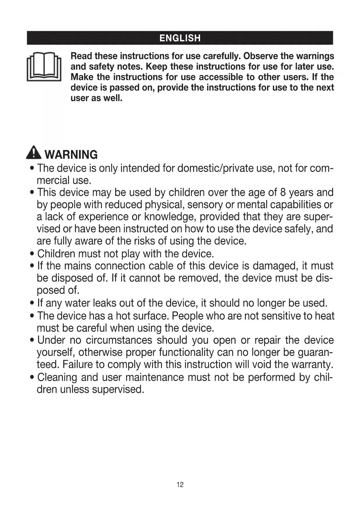 - The device is only intended for domestic/private use, not for com- mercial use.