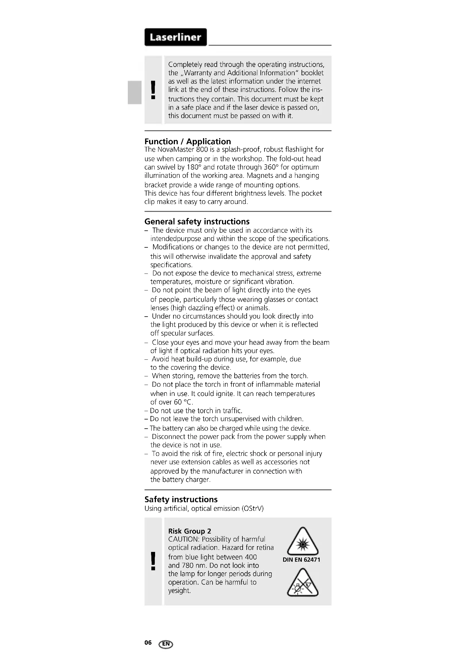 Safety instructions Using articial, optical emission (OStrV) General safety instructions – The device must only be used in accordance with its intendedpurpose and within the scope of the specifications. – Modifications or changes to the device are not permitted, this will otherwise invalidate the approval and safety specifications. – Do not expose the device to mechanical stress, extreme temperatures, moisture or significant vibration. – Do not point the beam of light directly into the eyes of people, particularly those wearing glasses or contact lenses (high dazzling effect) or animals. – Under no circumstances should you look directly into the light produced by this device or when it is reected off specular surfaces. – Close your eyes and move your head away from the beam of light if optical radiation hits your eyes. – Avoid heat build-up during use, for example, due to the covering the device. – When storing, remove the batteries from the torch. – Do not place the torch in front of inammable material when in use. It could ignite. It can reach temperatures of over 60 °C. – Do not use the torch in trafc. – Do not leave the torch unsupervised with children. – The battery can also be charged while using the device. – Disconnect the power pack from the power supply when the device is not in use. – To avoid the risk of re, electric shock or personal injury never use extension cables as well as accessories not approved by the manufacturer in connection with the battery charger. Function / Application The NovaMaster 800 is a splash-proof, robust ashlight for use when camping or in the workshop. The fold-out head can swivel by 180° and rotate through 360° for optimum illumination of the working area. Magnets and a hanging bracket provide a wide range of mounting options. This device has four different brightness levels. The pocket clip makes it easy to carry around. Completely read through the operating instructions, the „Warranty and Additional Information“ booklet as well as the latest information under the internet link at the end of these instructions. Follow the ins- tructions they contain. This document must be kept in a safe place and if the laser device is passed on, this document must be passed on with it.