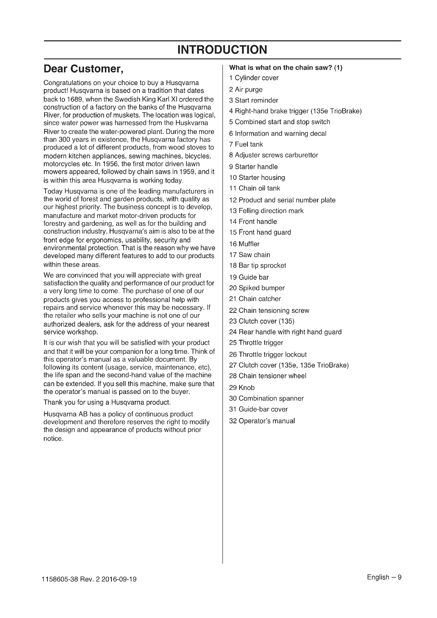 - EC Declaration of Conformity INTRODUCTION English – 9 1158605-38 Rev. 2 2016-09-19 Dear Customer, Congratulations on your choice to buy a Husqvarna product! Husqvarna is based on a tradition that dates back to 1689, when the Swedish King Karl XI ordered the construction of a factory on the banks of the Husqvarna River, for production of muskets. The location was logical, since water power was harnessed from the Huskvarna River to create the water-powered plant. During the more than 300 years in existence, the Husqvarna factory has produced a lot of different products, from wood stoves to modern kitchen appliances, sewing machines, bicycles, motorcycles etc. In 1956, the first motor driven lawn mowers appeared, followed by chain saws in 1959, and it is within this area Husqvarna is working today. Today Husqvarna is one of the leading manufacturers in the world of forest and garden products, with quality as our highest priority. The business concept is to develop, manufacture and market motor-driven products for forestry and gardening, as well as for the building and construction industry. Husqvarna ′s aim is also to be at the front edge for ergonomics, usability, security and environmental protection. That is the reason why we have developed many different features to add to our products within these areas. We are convinced that you will appreciate with great satisfaction the quality and performance of our product for a very long time to come. The purchase of one of our products gives you access to professional help with repairs and service whenever this may be necessary. If the retailer who sells your machine is not one of our authorized dealers, ask for the address of your nearest service workshop. It is our wish that you will be satisfied with your product and that it will be your companion for a long time. Think of this operator ′s manual as a valuable document. By following its content (usage, service, maintenance, etc), the life span and the second-hand value of the machine can be extended. If you sell this machine, make sure that the operator ′s manual is passed on to the buyer. Thank you for using a Husqvarna product. Husqvarna AB has a policy of continuous product development and therefore reserves the right to modify the design and appearance of products without prior notice. What is what on the chain saw? (1) 1 Cylinder cover 2 Air purge 3 Start reminder 4 Right-hand brake trigger (135e TrioBrake) 5 Combined start and stop switch 6 Information and warning decal 7 Fuel tank 8 Adjuster screws carburettor 9 Starter handle 10 Starter housing 11 Chain oil tank 12 Product and serial number plate 13 Felling direction mark 14 Front handle 15 Front hand guard 16 Muffler 17 Saw chain 18 Bar tip sprocket 19 Guide bar 20 Spiked bumper 21 Chain catcher 22 Chain tensioning screw 23 Clutch cover (135) 24 Rear handle with right hand guard 25 Throttle trigger 26 Throttle trigger lockout 27 Clutch cover (135e, 135e TrioBrake) 28 Chain tensioner wheel 29 Knob 30 Combination spanner 31 Guide-bar cover 32 Operator’s manualGENERAL SAFETY PRECAUTIONS 10 – English 1158605-38 Rev. 2 2016-09-19 Before using a new chain saw p. 33