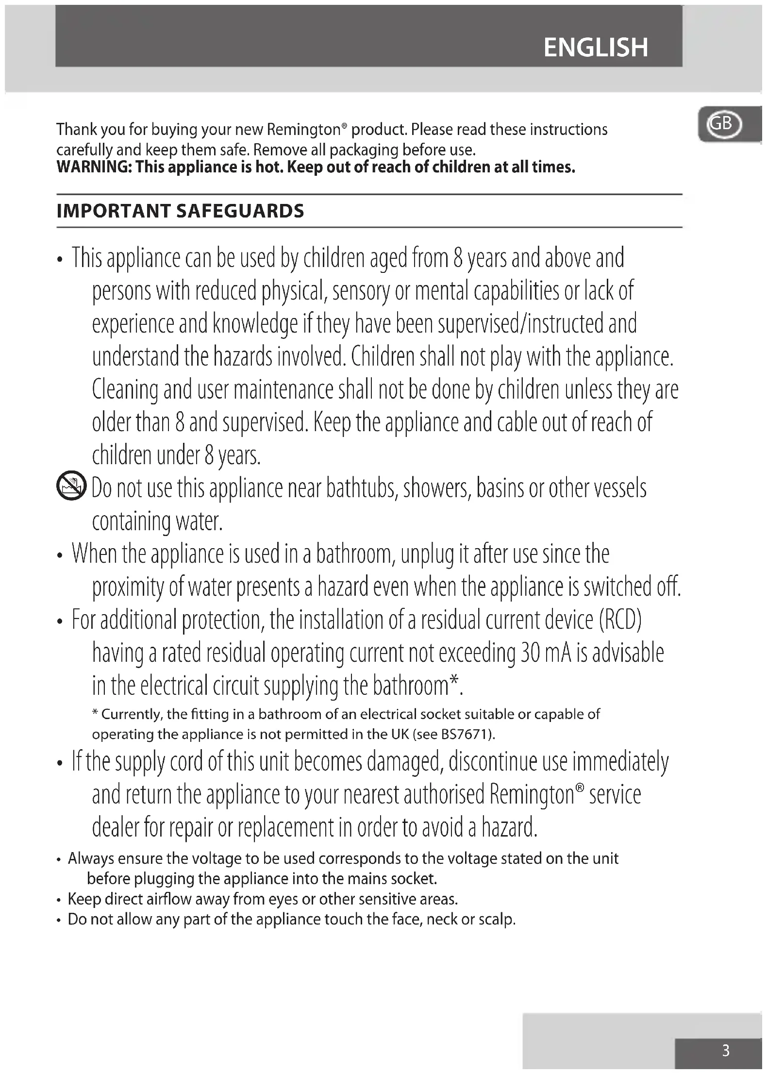 Thank you for buying your new Remington® product. Please read these instructions carefully and keep them safe. Remove all packaging before use.