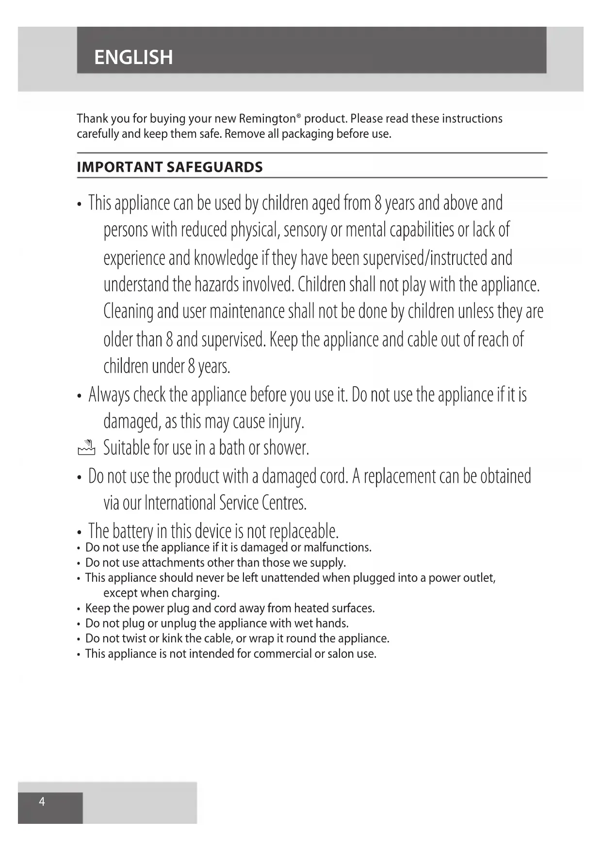ENGLISH Thank you for buying your new Remington® product. Please read these instructions carefully and keep them safe. Remove all packaging before use. IMPORTANT SAFEGUARDS