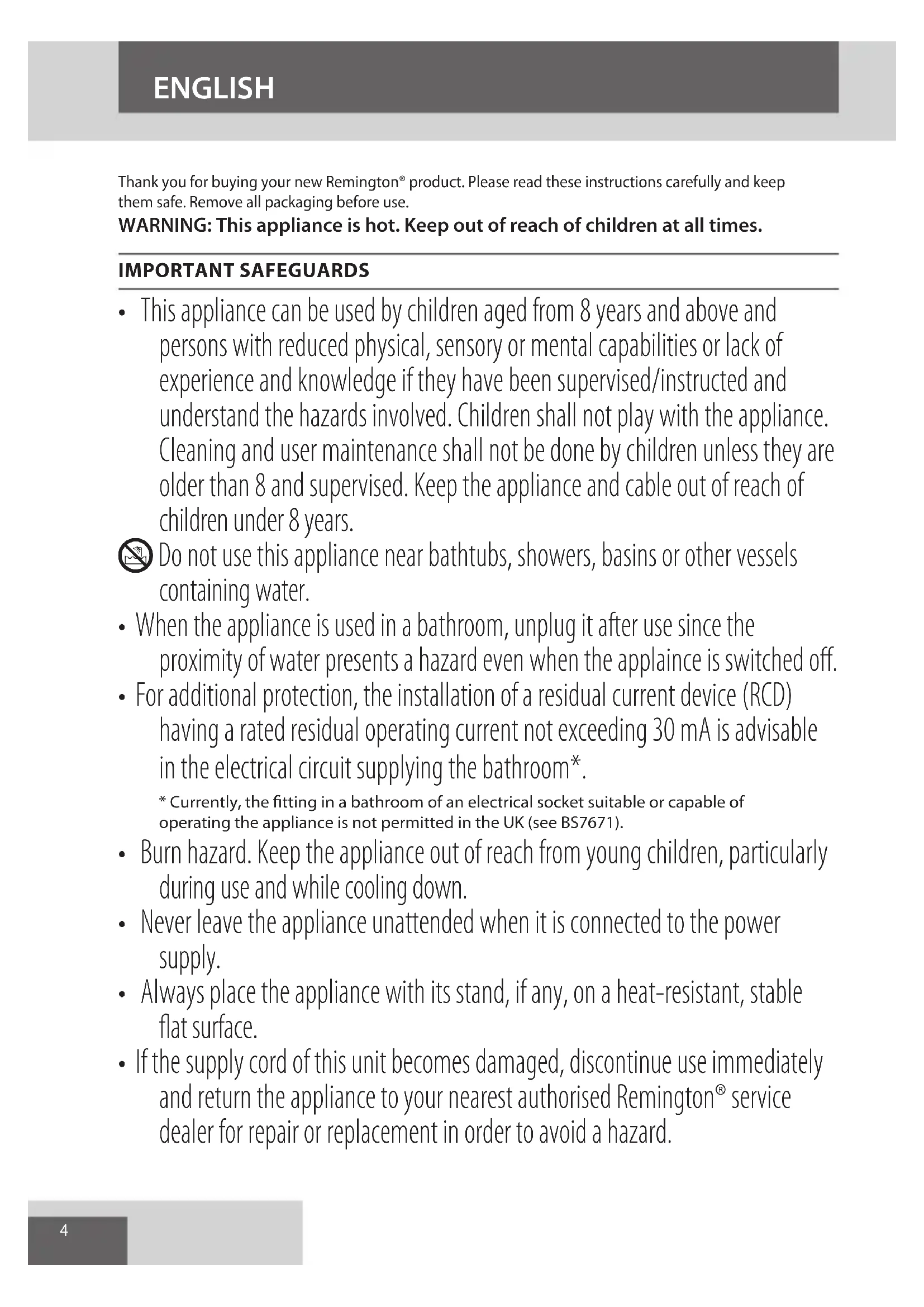 - If the supply cord of this unit becomes damaged, discontinue use immediately and return the appliance to your nearest authorised Remington® service dealer for repair or replacement in order to avoid a hazard. ENGLISH5 ENGLISH