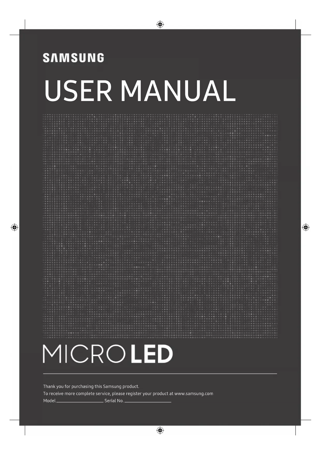 Thank you for purchasing this Samsung product. To receive more complete service, please register your product at www.samsung.com Model Serial No. USER MANUALBefore Reading This User Manual This MICRO LED comes with this User Manual and an embedded e-Manual ( > Settings > e-Manual). Warning! Important Safety Instructions Please read the Safety Instructions before using your MICRO LED. Refer to the table below for an explanation of symbols which may be on your Samsung product. CAUTION RISK OF ELECTRIC SHOCK. DO NOT OPEN. CAUTION: TO REDUCE THE RISK OF ELECTRIC SHOCK, DO NOT REMOVE COVER (OR BACK). THERE ARE NO USER SERVICEABLE PARTS INSIDE. REFER ALL SERVICING TO QUALIFIED PERSONNEL. This symbol indicates that high voltage is present inside. It is dangerous to make any kind of contact with any internal part of this product. This symbol indicates that this product has included important literature concerning operation and maintenance. Class II product: This symbol indicates that a safety connection to electrical earth (ground) is not required. If this symbol is not present on a product with a mains lead, the product MUST have a reliable connection to protective earth (ground). AC voltage: Rated voltage marked with this symbol is AC voltage. DC voltage: Rated voltage marked with this symbol is DC voltage. Caution. Consult instructions for use: This symbol instructs the user to consult the user manual for further safety related information. Power