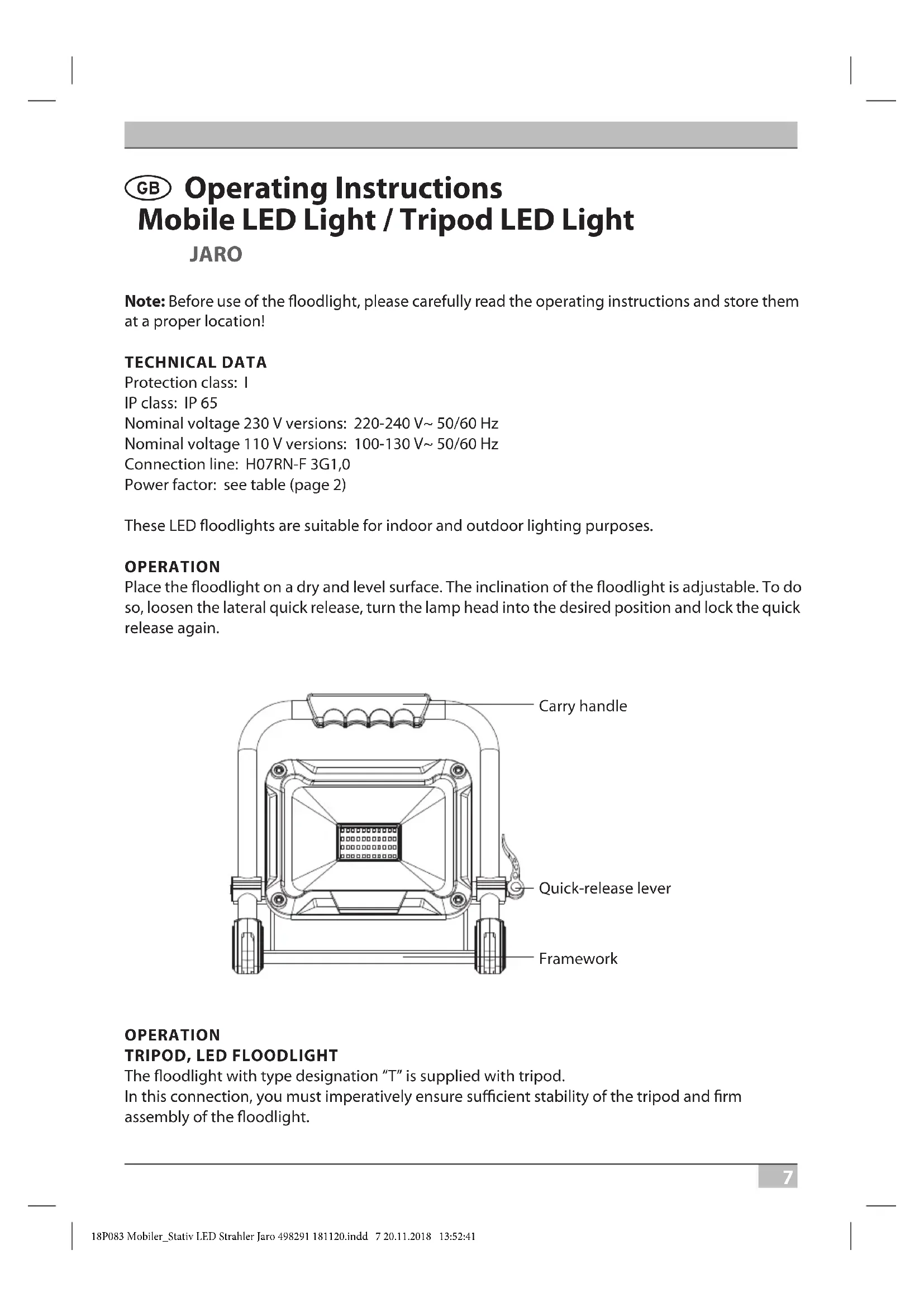 The oodlight with type designation “T” is supplied with tripod. In this connection, you must imperatively ensure sucient stability of the tripod and rm assembly of the oodlight. 18P083 Mobiler_Stativ LED Strahler Jaro 498291 181120.indd 7 20.11.2018 13:52:418