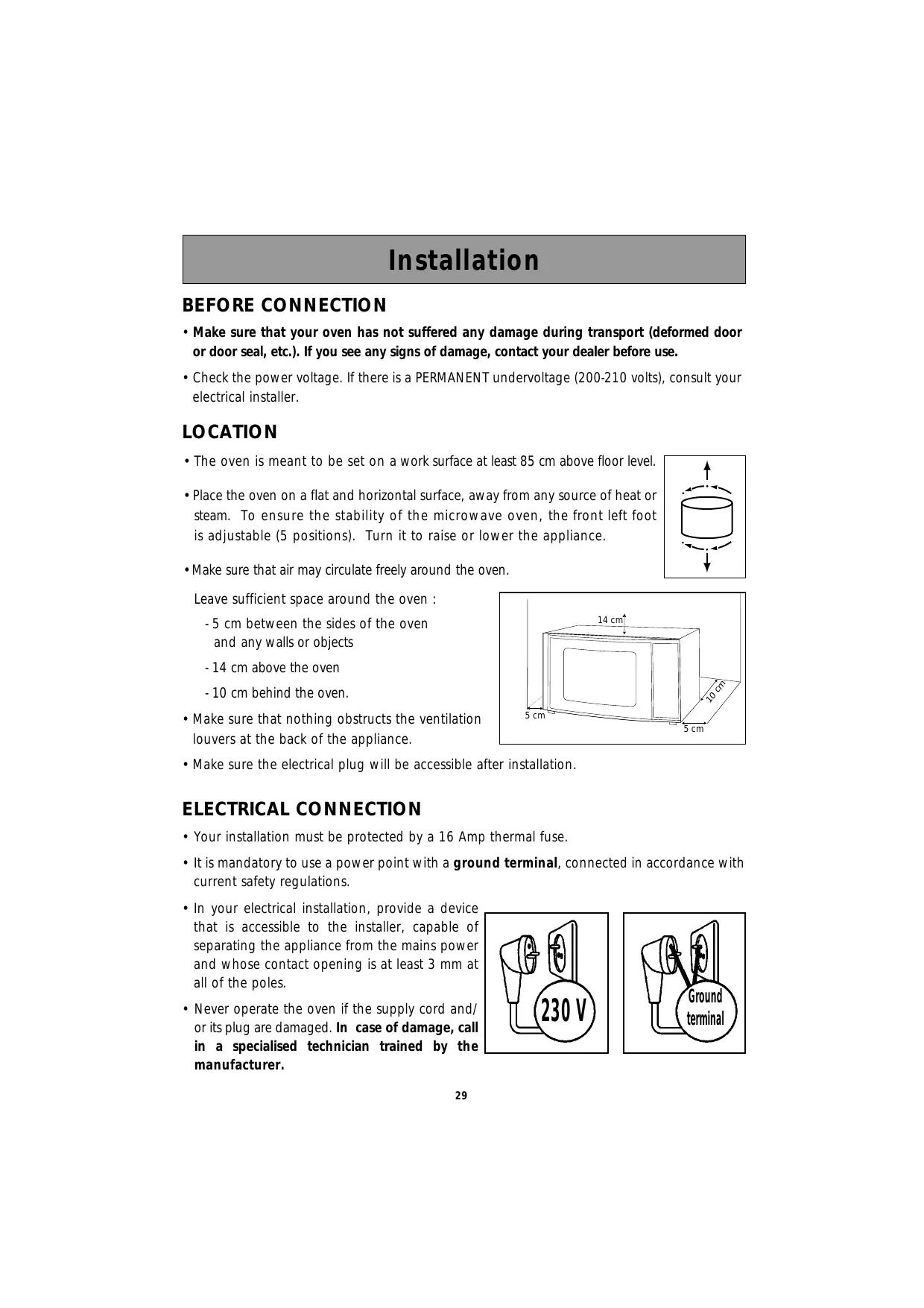 LOCATION • The oven is meant to be set on a work surface at least 85 cm above floor level. • Place the oven on a flat and horizontal surface, away from any source of heat or steam. To ensure the stability of the microwave oven, the front left foot is adjustable (5 positions). Turn it to raise or lower the appliance. •Make sure that air may circulate freely around the oven. Leave sufficient space around the oven : 14 cm