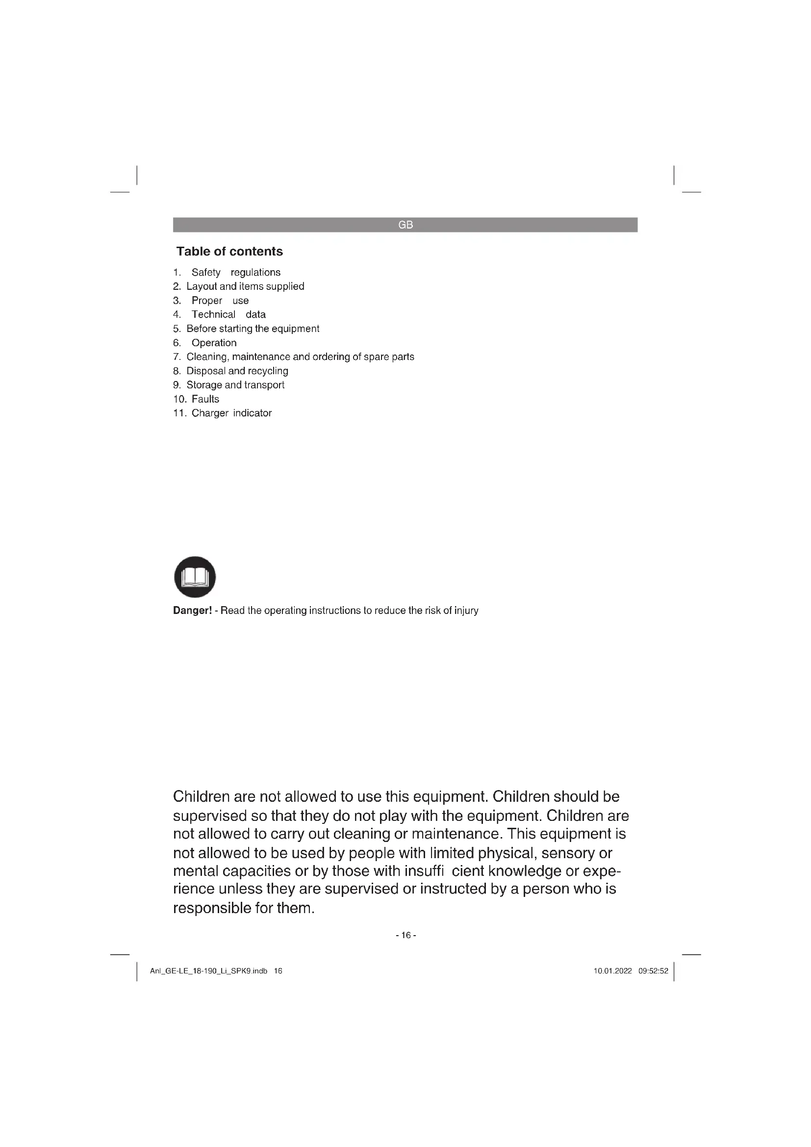 Danger! - Read the operating instructions to reduce the risk of injury Children are not allowed to use this equipment. Children should be supervised so that they do not play with the equipment. Children are not allowed to carry out cleaning or maintenance. This equipment is not allowed to be used by people with limited physical, sensory or mental capacities or by those with insuffi cient knowledge or expe- rience unless they are supervised or instructed by a person who is responsible for them. Anl_GE-LE_18-190_Li_SPK9.indb 16Anl_GE-LE_18-190_Li_SPK9.indb 16 10.01.2022 09:52:5210.01.2022 09:52:52GB