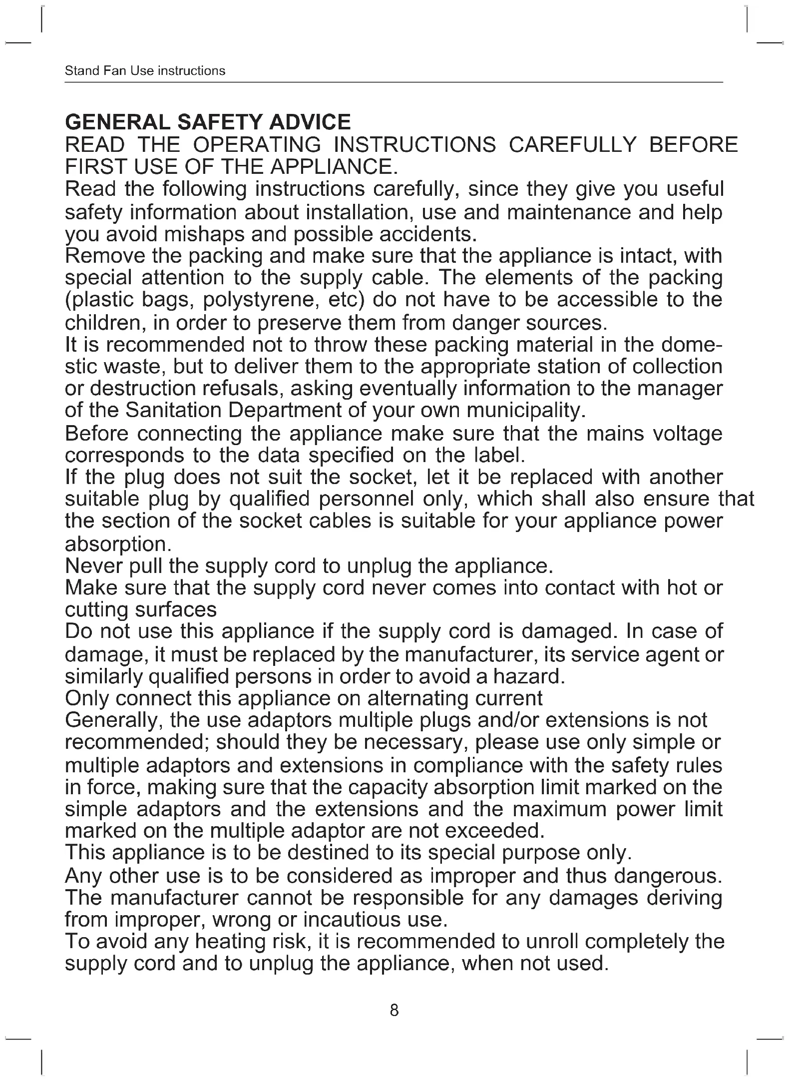 FIRST USE OF THE APPLIANCE. Read the following instructions carefully, since they give you useful safety information about installation, use and maintenance and help you avoid mishaps and possible accidents. Remove the packing and make sure that the appliance is intact, with special attention to the supply cable. The elements of the packing (plastic bags, polystyrene, etc) do not have to be accessible to the children, in order to preserve them from danger sources. It is recommended not to throw these packing material in the dome- stic waste, but to deliver them to the appropriate station of collection or destruction refusals, asking eventually information to the manager of the Sanitation Department of your own municipality. Before connecting the appliance make sure that the mains voltage corresponds to the data specied on the label. If the plug does not suit the socket, let it be replaced with another suitable plug by qualied personnel only, which shall also ensure that the section of the socket cables is suitable for your appliance power absorption. Never pull the supply cord to unplug the appliance. Make sure that the supply cord never comes into contact with hot or cutting surfaces Do not use this appliance if the supply cord is damaged. In case of damage, it must be replaced by the manufacturer, its service agent or similarly qualied persons in order to avoid a hazard. Only connect this appliance on alternating current Generally, the use adaptors multiple plugs and/or extensions is not recommended; should they be necessary, please use only simple or multiple adaptors and extensions in compliance with the safety rules in force, making sure that the capacity absorption limit marked on the simple adaptors and the extensions and the maximum power limit marked on the multiple adaptor are not exceeded. This appliance is to be destined to its special purpose only. Any other use is to be considered as improper and thus dangerous. The manufacturer cannot be responsible for any damages deriving from improper, wrong or incautious use. To avoid any heating risk, it is recommended to unroll completely the supply cord and to unplug the appliance, when not used.EN Stand Fan Use instructions