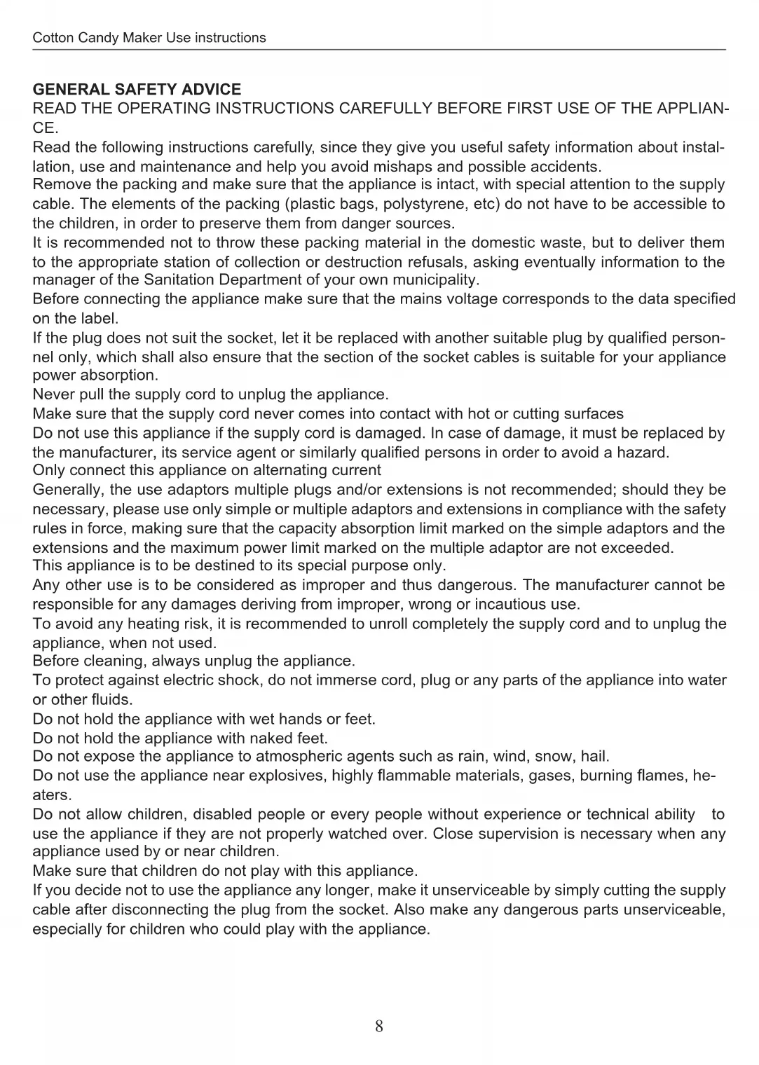 READ THE OPERATING INSTRUCTIONS CAREFULLY BEFORE FIRST USE OF THE APPLIAN- CE. Read the following instructions carefully, since they give you useful safety information about instal- lation, use and maintenance and help you avoid mishaps and possible accidents. Remove the packing and make sure that the appliance is intact, with special attention to the supply cable. The elements of the packing (plastic bags, polystyrene, etc) do not have to be accessible to the children, in order to preserve them from danger sources. It is recommended not to throw these packing material in the domestic waste, but to deliver them to the appropriate station of collection or destruction refusals, asking eventually information to the manager of the Sanitation Department of your own municipality. Before connecting the appliance make sure that the mains voltage corresponds to the data specied on the label. If the plug does not suit the socket, let it be replaced with another suitable plug by qualied person- nel only, which shall also ensure that the section of the socket cables is suitable for your appliance power absorption. Never pull the supply cord to unplug the appliance. Make sure that the supply cord never comes into contact with hot or cutting surfaces Do not use this appliance if the supply cord is damaged. In case of damage, it must be replaced by the manufacturer, its service agent or similarly qualied persons in order to avoid a hazard. Only connect this appliance on alternating current Generally, the use adaptors multiple plugs and/or extensions is not recommended; should they be necessary, please use only simple or multiple adaptors and extensions in compliance with the safety rules in force, making sure that the capacity absorption limit marked on the simple adaptors and the extensions and the maximum power limit marked on the multiple adaptor are not exceeded. This appliance is to be destined to its special purpose only. Any other use is to be considered as improper and thus dangerous. The manufacturer cannot be responsible for any damages deriving from improper, wrong or incautious use. To avoid any heating risk, it is recommended to unroll completely the supply cord and to unplug the appliance, when not used. Before cleaning, always unplug the appliance. To protect against electric shock, do not immerse cord, plug or any parts of the appliance into water or other uids. Do not hold the appliance with wet hands or feet. Do not hold the appliance with naked feet. Do not expose the appliance to atmospheric agents such as rain, wind, snow, hail. Do not use the appliance near explosives, highly ammable materials, gases, burning ames, he- aters. Do not allow children, disabled people or every people without experience or technical ability to use the appliance if they are not properly watched over. Close supervision is necessary when any appliance used by or near children. Make sure that children do not play with this appliance. If you decide not to use the appliance any longer, make it unserviceable by simply cutting the supply cable after disconnecting the plug from the socket. Also make any dangerous parts unserviceable, especially for children who could play with the appliance.ENGLISH Cotton Candy Maker Use instructions