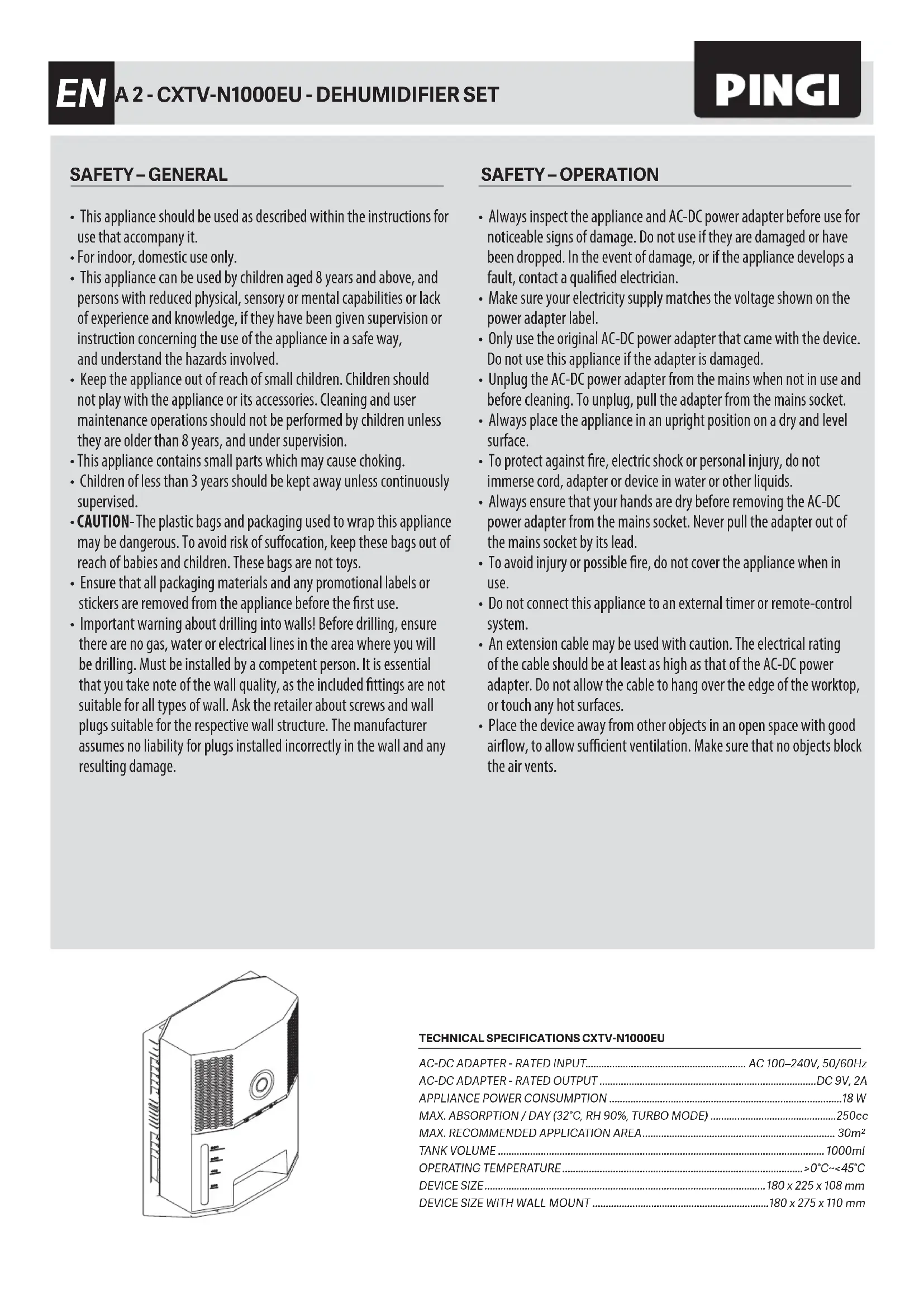 CXTV-N1000EU_VIDA2 EN_v2.indd 3 06-11-20(W45) 16:11INTENDED USEYour new Pingi Vida 2 Dehumidifier set (CXTV-N1000EU) is suitable for dehumidifying enclosed indoor spaces. The appliance is powered by the 9V AC-DC adapter that is supplied with the device. The power adapter operates on 100-240V, 50/60Hz (mains electricity). Never try to connect the device or power adapter to other power sources. Please always follow the safety instructions in this manual. Keep this instruction manual in a safe place, so that it is available at all times. This product complies with regulatory, national and European requirements. Never try to make technical modifications to this device. We do not accept liability for accidents or damages resulting from failure to follow these operating and safety instructions.FUNCTION AND APPLICATIONThe Pingi Vida 2 Dehumidifier set (CXTV-N1000EU) was developed as a compact dehumidifier set that captures excess moisture in indoor spaces. This product is ideally suited for unventilated indoor spaces. The captured moisture is collected in the integrated tank. WHAT TO EXPECTThe Vida 2 is a thermoelectric dehumidifier. The performance of this type of dehumidifier depends on the amount of water in the air. The higher the air temperature, the more water air can contain (relative humidity). At high room temperatures, the device needs to work a lot harder, and it has to remove more moisture to decrease the relative humidity level. Vida 2 will then collect up to 250ml of water per day, and you might need to empty out the water tank often. In a colder room, there will be less water to capture, and the tank will fill more slowly. Is room temperature <10°C? There will not be much moisture in the air, and the tank will fill only slowly.BEFORE YOU STARTPlease carefully read the safety instructions on the front page of this manual before getting started. WALL MOUNT INSTALLATIONThis set comes with an included wall mount, model VSB-1S. Use of the wall mount is optional - the appliance can also be used without it.To use the wall mount, it needs to be securely installed on a vertical surface by means of 3 screws. 1. Select a vertical surface that provides sufficient distance to the wall mount and other objects.