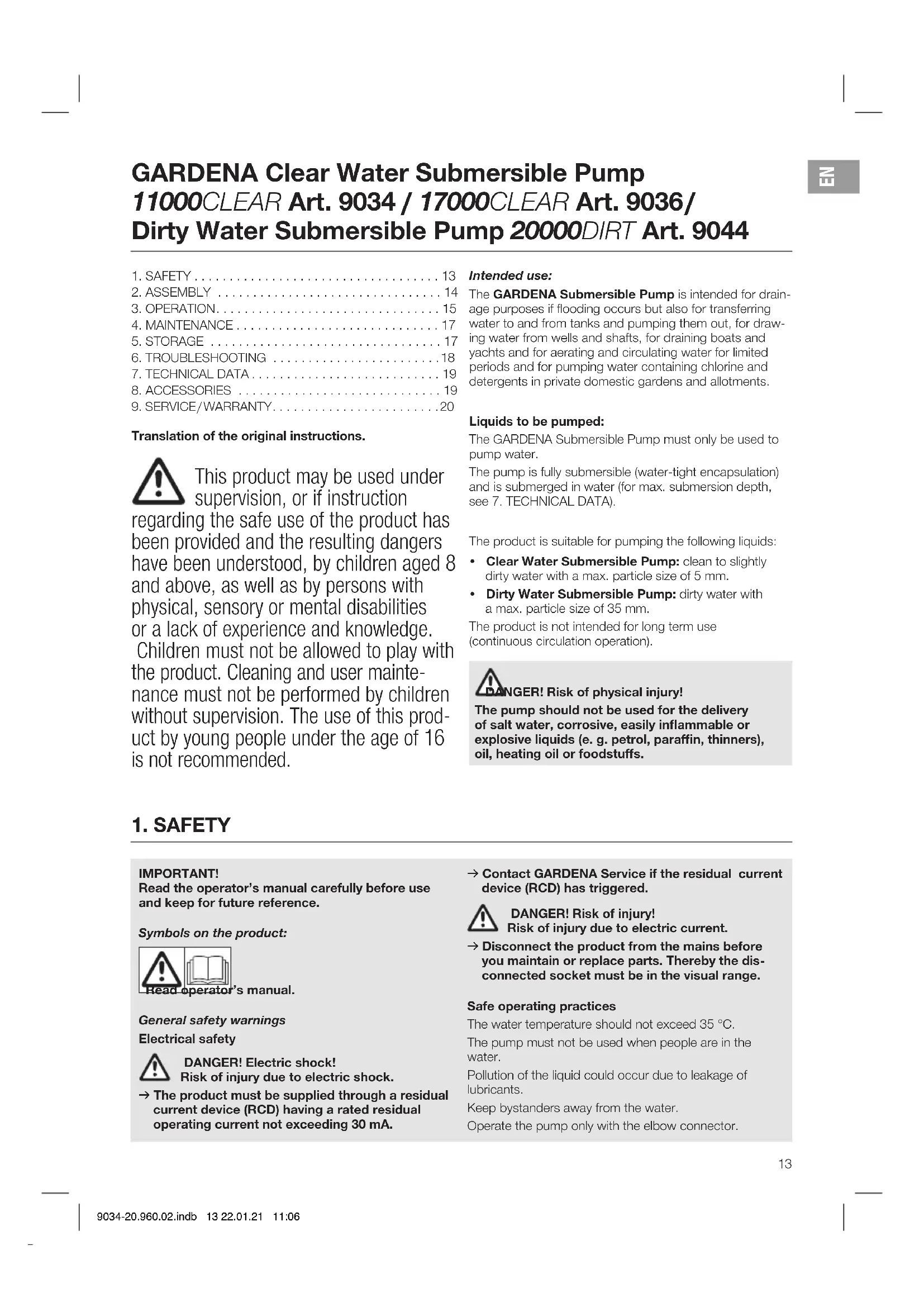 IMPORTANT! Read the operator’s manual carefully before use and keep for future reference. Symbols on the product: Read operator’s manual. General safety warnings Electrical safety DANGER! Electric shock! Risk of injury due to electric shock. v The product must be supplied through a residual current device (RCD) having a rated residual operating current not exceeding 30 mA. v Contact GARDENA Service if the residual current device (RCD) has triggered. DANGER! Risk of injury! Risk of injury due to electric current. v Disconnect the product from the mains before you maintain or replace parts. Thereby the dis- connected socket must be in the visual range. Safe operating practices The water temperature should not exceed 35 °C. The pump must not be used when people are in the water. Pollution of the liquid could occur due to leakage of lubricants. Keep bystanders away from the water. Operate the pump only with the elbow connector. GARDENA Clear Water Submersible Pump 11000CLEAR Art. 9034 / 17000CLEAR Art. 9036 / Dirty Water Submersible Pump 20000DIRT Art. 9044