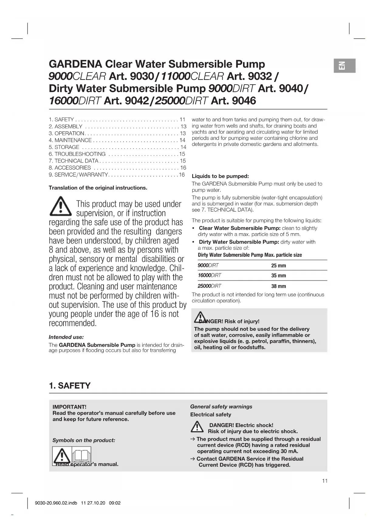 Translation of the original instructions. This product may be used under supervision, or if instruction regarding the safe use of the product has been provided and the resulting dangers have been understood, by children aged 8and above, as well as by persons with physical, sensory or mental disabilities or a lack of experience and knowledge. Chil- dren must not be allowed to play with the product. Cleaning and user maintenance must not be performed by children with- out supervision. The use of this product by young people under the age of 16 is not recommended. Intended use: The GARDENA Submersible Pump is intended for drain- age purposes if flooding occurs but also for transferring water to and from tanks and pumping them out, for draw- ing water from wells and shafts, for draining boats and yachts and for aerating and circulating water for limited periods and for pumping water containing chlorine and detergents in private domestic gardens and allotments. Liquids to be pumped: The GARDENA Submersible Pump must only be used to pump water. The pump is fully submersible (water-tight encapsulation) and is submerged in water (for max. submersion depth see 7. TECHNICAL DATA). The product is suitable for pumping the following liquids:
