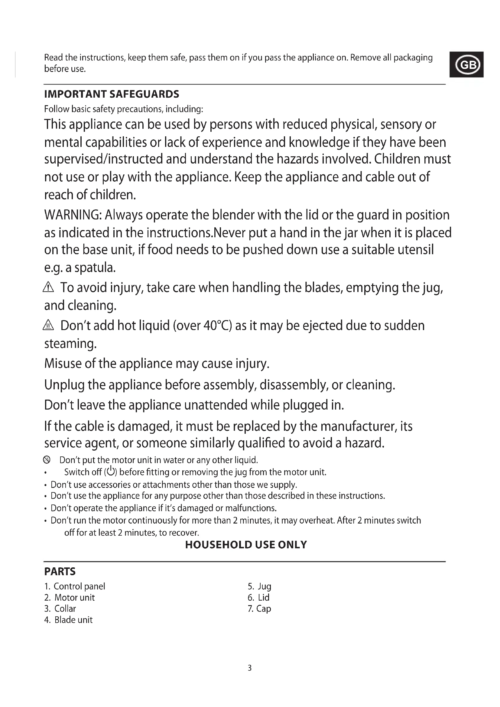 Read the instructions, keep them safe, pass them on if you pass the appliance on. Remove all packaging before use. IMPORTANT SAFEGUARDS Follow basic safety precautions, including: This appliance can be used by persons with reduced physical, sensory or mental capabilities or lack of experience and knowledge if they have been supervised/instructed and understand the hazards involved. Children must not use or play with the appliance. Keep the appliance and cable out of reach of children.