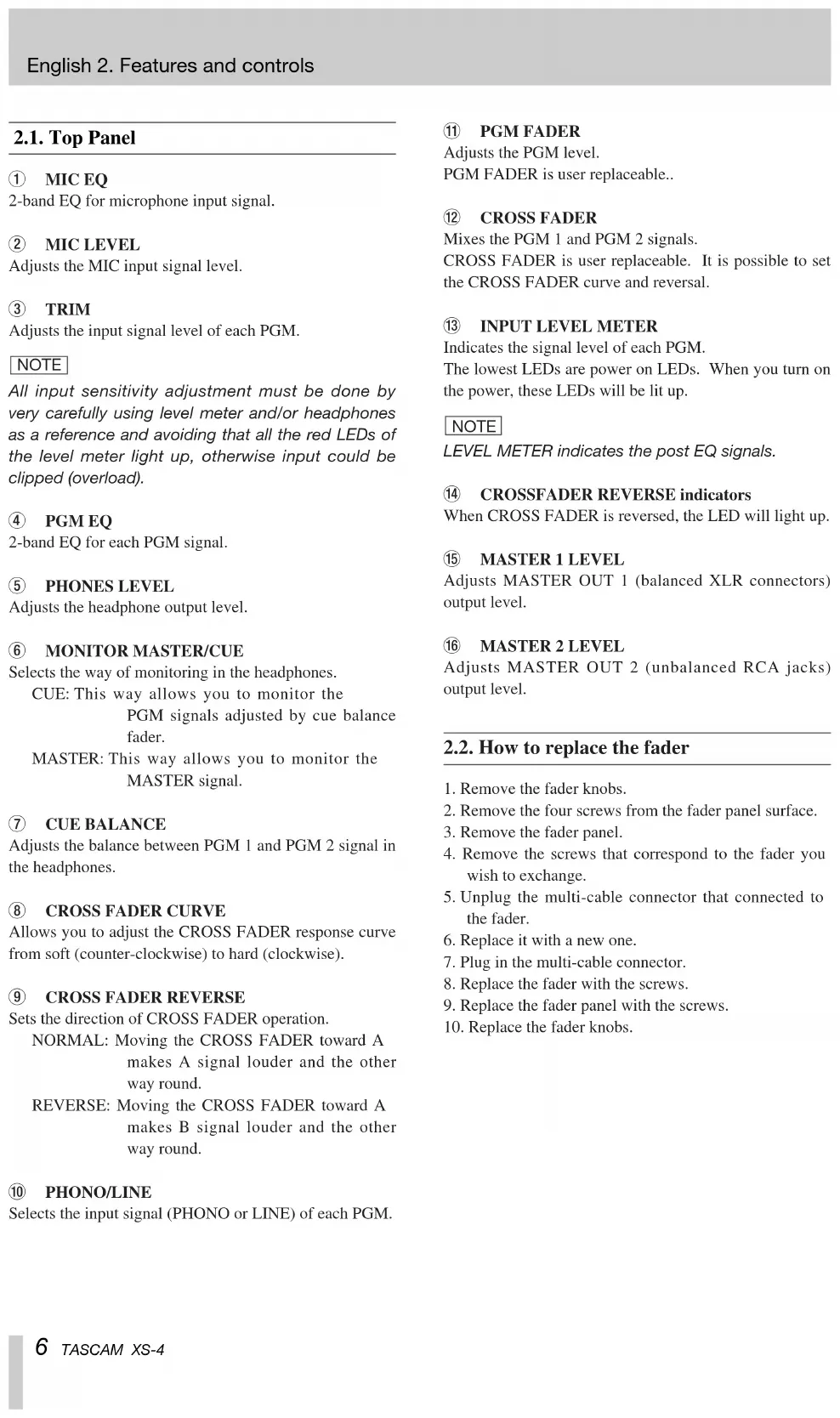 2.3. Rear Panel u MIC INPUT (balanced TRS connector) Connect the microphone to this connector. Connections are as follows: TRS HOT: Tip COLD: Ring GND: Sleeve If you connect the unbalanced microphone to this connector, we recommend that cold (Pin 3 or Ring) short-circuited to GND (Pin 1 or Sleeve). i ADJ Adjusts the microphone input signal gain. MIC input sensitivity adjustment must be done by very carefully using the headphones as a reference and avoiding that input could be clipped (overload). o PHONO INPUTS (unbalanced RCA jacks) Connect the turntables equipped with the MM cartrige. p GND terminal If the turntables are fitted with grounding wires, connect these to this GND terminal to reduce noise and hum. a LINE INPUTS (unbalanced RCA jacks) Connect the line level equipment, such as CD players, cassette decks, DAT, MD, etc. s EXT INPUT (unbalanced RCA jacks) Connect external line level equipment. The input signals from these jacks are mixed to master bus (pre MASTER 1/2 control). d REC OUTPUT (unbalanced RCA jacks) Outputs the pre MASTER 1/2 signal. For example, to connect the recorder to these jacks, you can record your live performance before MASTER LEVEL control. f MASTER OUTPUT 1 (balanced XLR connector) Outputs the master output signal adjusted by MASTER 1 control. Connections are as follows: HOT: Pin 2 COLD: Pin 3 GND: Pin 1 NOTE NOTE g MASTER OUTPUT 2 (unbalanced RCA jacks) Outputs the master output signal adjusted by MASTER 2 control. h POWER switch j AC POWER jack 2.4. Front Panel k PHONES Connect your headphone to this jack.8 TASCAM XS-4 English 3. Modification /4. Specifications