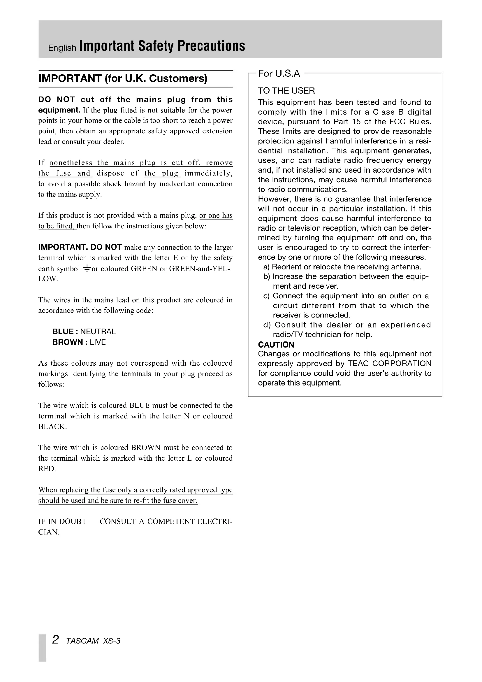 This equipment has been tested and found tocomply with the limits for a Class B digitaldevice, pursuant to Part 15 of the FCC Rules.These limits are designed to provide reasonableprotection against harmful interference in a resi-dential installation. This equipment generates,uses, and can radiate radio frequency energyand, if not installed and used in accordance withthe instructions, may cause harmful interferenceto radio communications.However, there is no guarantee that interferencewill not occur in a particular installation. If thisequipment does cause harmful interference toradio or television reception, which can be deter-mined by turning the equipment off and on, theuser is encouraged to try to correct the interfer-ence by one or more of the following measures.a) Reorient or relocate the receiving antenna.b) Increase the separation between the equip-ment and receiver.c) Connect the equipment into an outlet on acircuit different from that to which thereceiver is connected.d) Consult the dealer or an experiencedradio/TV technician for help.CAUTIONChanges or modifications to this equipment notexpressly approved by TEAC CORPORATIONfor compliance could void the user's authority tooperate this equipment. For U.S.A IMPORTANT (for U.K. Customers) DO NOT cut off the mains plug from thisequipment. If the plug fitted is not suitable for the powerpoints in your home or the cable is too short to reach a powerpoint, then obtain an appropriate safety approved extensionlead or consult your dealer.If nonetheless the mains plug is cut off, remove the fuse and dispose of the plug immediately, to avoid a possible shock hazard by inadvertent connectionto the mains supply.If this product is not provided with a mains plug, or one hasto be fitted, then follow the instructions given below:IMPORTANT. DO NOT make any connection to the largerterminal which is marked with the letter E or by the safetyearth symbol ç or coloured GREEN or GREEN-and-YEL- LOW. The wires in the mains lead on this product are coloured inaccordance with the following code:BLUE : NEUTRALBROWN : LIVEAs these colours may not correspond with the colouredmarkings identifying the terminals in your plug proceed asfollows:The wire which is coloured BLUE must be connected to theterminal which is marked with the letter N or colouredBLACK.The wire which is coloured BROWN must be connected tothe terminal which is marked with the letter L or coloured RED. When replacing the fuse only a correctly rated approved typeshould be used and be sure to re-fit the fuse cover.IF IN DOUBT — CONSULT A COMPETENT ELECTRI-CIAN.IMPORTANT SAFETY INSTRUCTIONS English TASCAM XS-3 3 CAUTION: ≠ Read all of these Instructions. ≠ Save these Instructions for later use. ≠ Follow all Warnings and Instructions marked on the audio equipment.