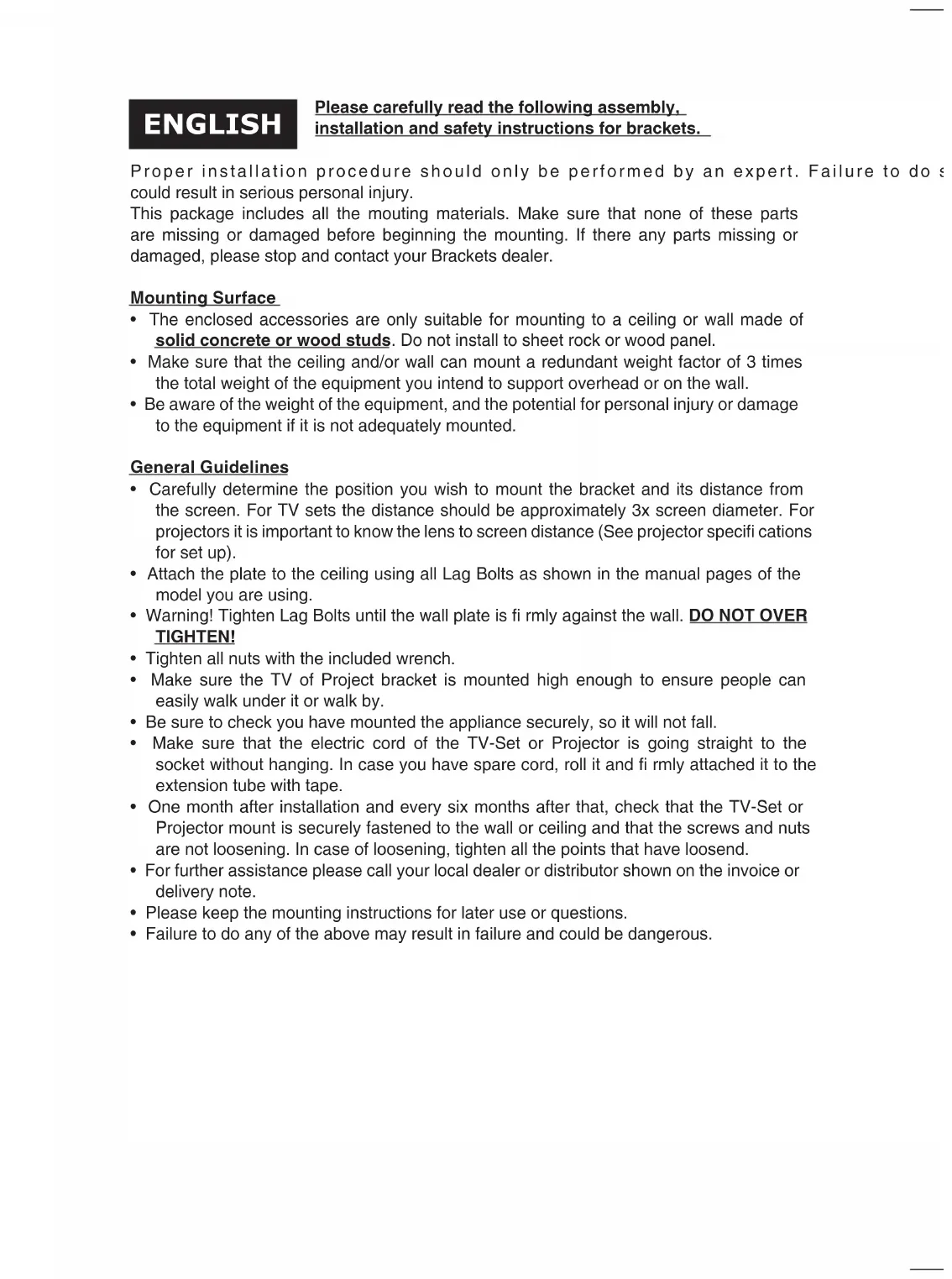 - Failure to do any of the above may result in failure and could be dangerous. ENGLISH2 Installation procedure Step 1: Invert the display and place it on a soft and fl at surface. Locate the mounting points on the back of the display. Many LCD manufacturers conform to VESA standards. The VESA standard defi nes the physical mounting interfaces. The LCD mount conforms to VESA 75/100/200/400 patterns. Plasma monitors come with a random set of holes. Note! Do not over tighten the screws. This may cause damage to the display or bracket. Before you begin, determine the desired mounting location. Step 2: Assemble the wall plate using the hardware and wrenches provided. Note! Tighten screws uniformly to prevent distortion that might affect the assembly process. Do not tighten with excessive force. Failure to follow these instructions may cause excessive stress to the screws, greatly reducing their strength. Solid concrete wall assembly: Carefully inspect the area where the LCD\Plasma\ Projector mount is to be installed. Check for any damage or loose cement. Caution! When drilling holes in a cement wall or wooden studs, be absolutely sure there are no water pipes or electrical wiring behind the wall. Use the wall plate to mark the positions of the drilling holes. Drill holes 3” deep using a (10 mm) masonry drill bit. Insert the plastic anchors into the hole and tap fl ush until the washer is even with the concrete surface. Place the back plate onto the concrete surface and slowly tighten each nut onto its respective anchor. Wood studs assembly: Use a stud sensor (sold separately) to locate framing near the desired mounting position. Note! Framing beams are typically 1-1/2”- 2” wide and spaced 16” on center. We recommend locating more than one stud to fi nd a trend in stud spacing. Using a sharp device penetrate the drywall to identify the true center of the stud. Using the wall plate base as a template, position the wall plate base vertically. Mark the hole position on the wall, making sure you use the center screw holes. Use a level to check horizontal alignment of marks. Step 3: For tilting models, gently pull the left and the right upper edges of the display to extend the mount to its desired display tilting angle. Using a Phillips screwdriver, adjust the tilt mechanism to its desired position. LCD mount models are designed to maintain their tilting angle by using fi nger tips on the back of the monitor. Keeping the display far from the tilting mechanism, turn the Philips screw to its desired angle. Step 4: Once the mounting of the display is completed, you can tills move the display from side to side to optimize the fi nal position of the display. Gently slide the unit from left to right over the steel rods on the wall plate.3 LIMITED WARRANTY