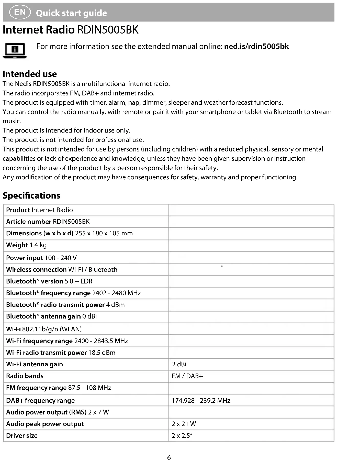 Quick start guide Internet Radio RDIN5005BK For more information see the extended manual online: ned.is/rdin5005bk Intended use The Nedis RDIN5005BK is a multifunctional internet radio. The radio incorporates FM, DAB+ and internet radio. The product is equipped with timer, alarm, nap, dimmer, sleeper and weather forecast functions. You can control the radio manually, with remote or pair it with your smartphone or tablet via Bluetooth to stream music. The product is intended for indoor use only. The product is not intended for professional use. This product is not intended for use by persons (including children) with a reduced physical, sensory or mental capabilities or lack of experience and knowledge, unless they have been given supervision or instruction concerning the use of the product by a person responsible for their safety. Any modification of the product may have consequences for safety, warranty and proper functioning. Specications Product Internet Radio Article number RDIN5005BK Dimensions (w x h x d) 255 x 180 x 105 mm Weight 1.4 kg Power input 100 - 240 V Wireless connection Wi-Fi / Bluetooth