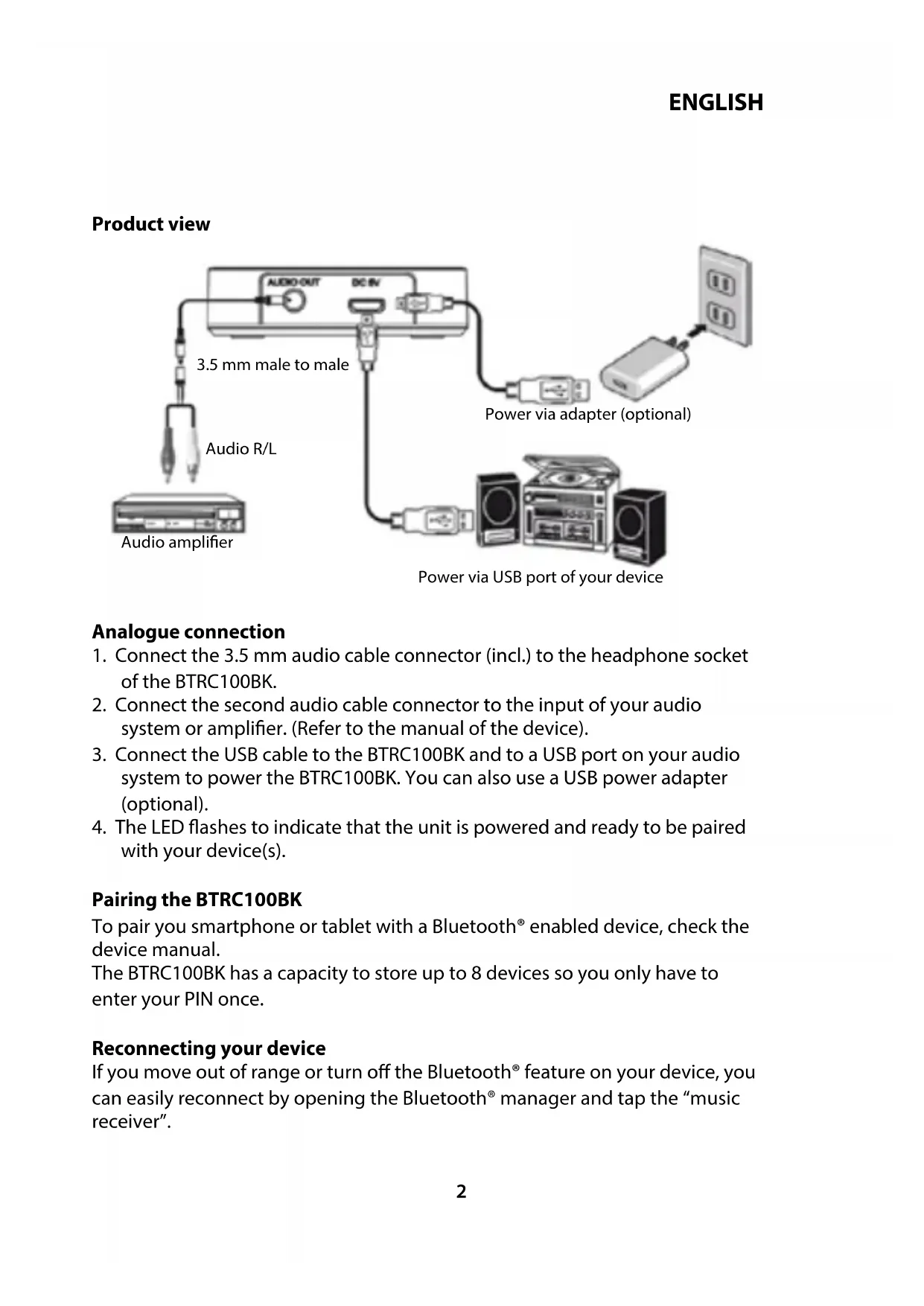 with your device(s). Pairing the BTRC100BK To pair you smartphone or tablet with a Bluetooth® enabled device, check the device manual. The BTRC100BK has a capacity to store up to 8 devices so you only have to enter your PIN once. Reconnecting your device If you move out of range or turn o the Bluetooth® feature on your device, you can easily reconnect by opening the Bluetooth® manager and tap the “music receiver”. ENGLISH3 A connection is automatically established if the BTRC100BK is powered. If you want to switch from one device to another, follow the steps below: