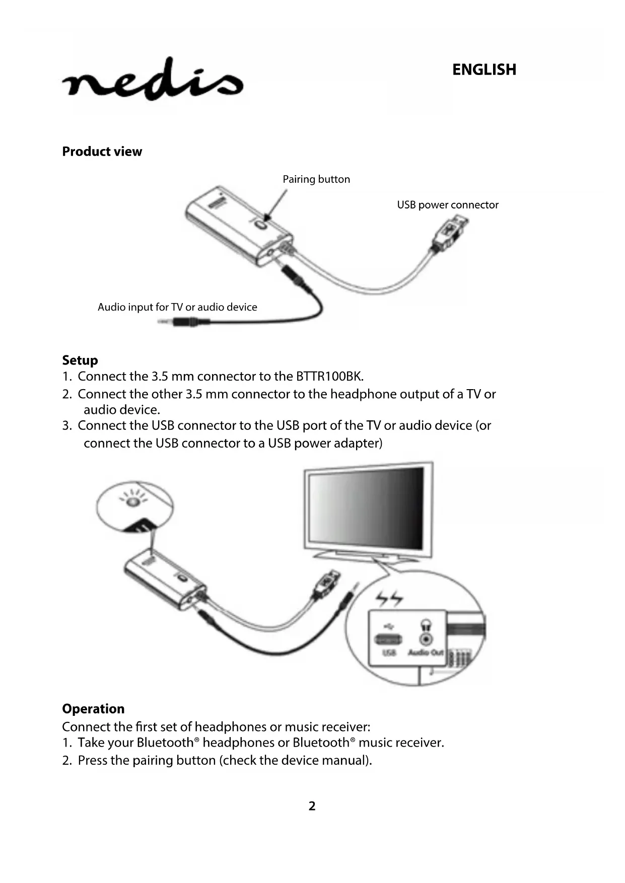 Note The BTTR100BK features the option to connect two Bluetooth® A2DP devices at the same time. If you would like to connect a second A2DP device, you need to reset the BTTR100BK to establish a new connection. Reset Press the pairing button on the BTTR100BK and release it again. The LED light on the BTTR100BK starts blinking while the transmitter is searching for A2DP devices nearby. LED indication Indication Meaning Description Flash every 5seconds Pairing Searching for a device in pairing mode Constantly switched on Connected BTTR100BK and device are connected Troubleshooting If you do not hear any sound coming from your headphones or music receiver, check the following: - make sure the BTTR100BK is powered; - make sure the audio cable is correctly connected to the BTTR100BK; - make sure that the audio source is working properly; - make sure the volume of the audio source is set correctly; - make sure your device is at a maximum distance of 10metres of the audio transmitter.ENGLISH