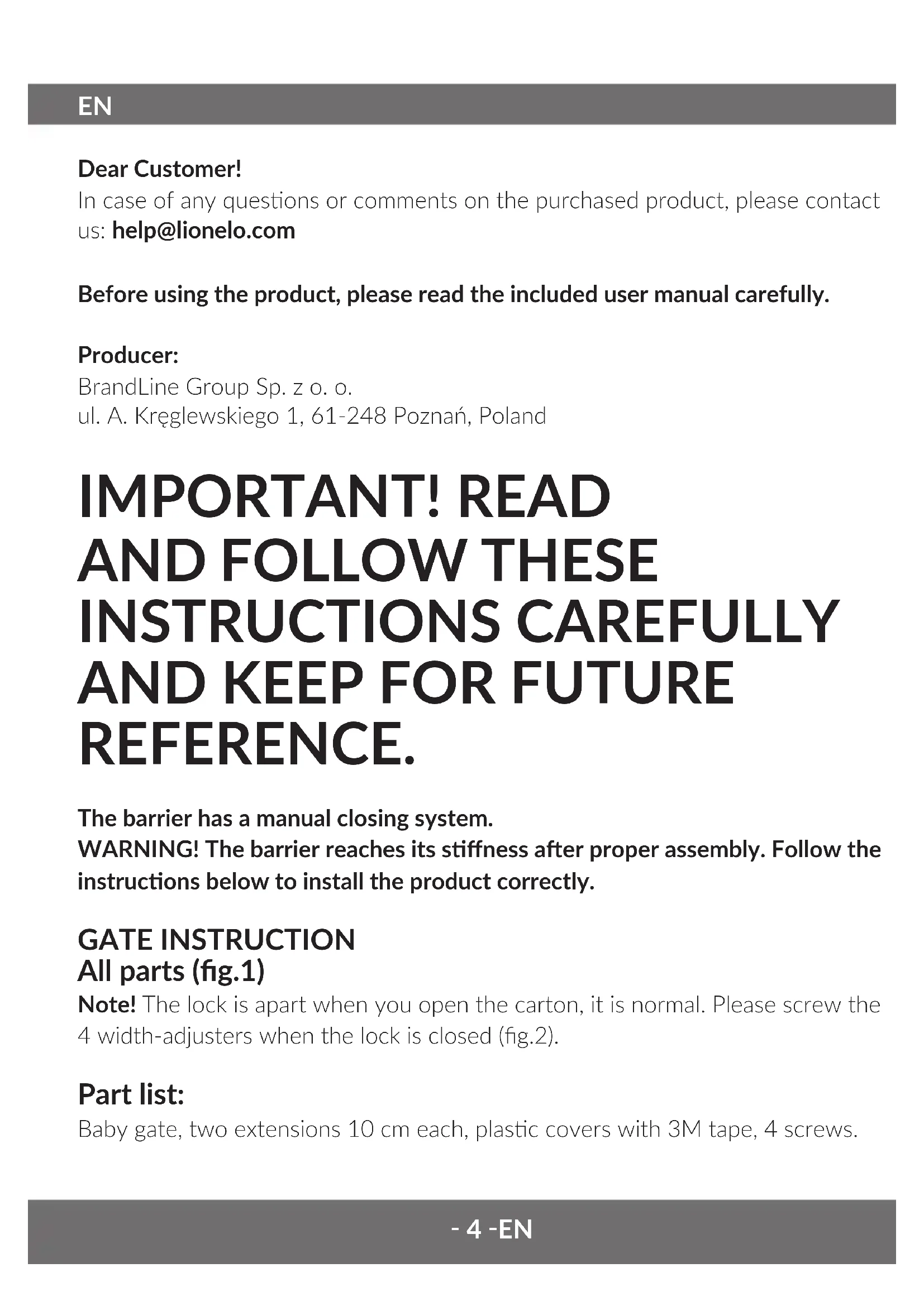 REFERENCE. The barrier has a manual closing system. WARNING! The barrier reaches its sness aer proper assembly. Follow the instrucons below to install the product correctly. GATE INSTRUCTION All parts (g.1) Note! The lock is apart when you open the carton, it is normal. Please screw the 4 width-adjusters when the lock is closed (g.2). Part list: Baby gate, two extensions 10 cm each, plasc covers with 3M tape, 4 screws.‑ 5 ‑ EN Installaon places This product is suitable for indoor places, such as bedroom, kitchen, stairs, hallways etc (g. 3).