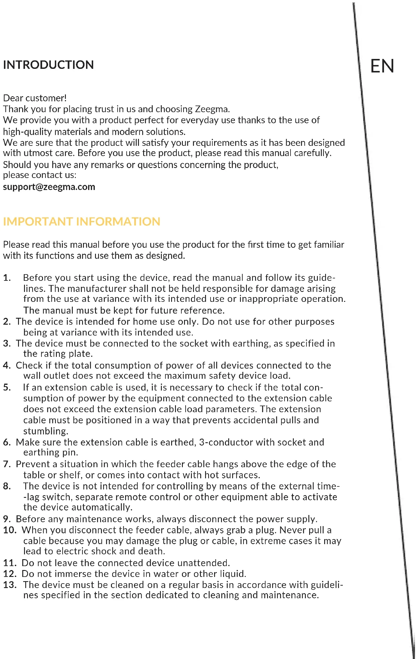 Knapper EN DE PL IT FR ES NL UK LT HR User manual Bedienungsanleitung Instrukcja obsługi Manuale d’uso Manuel de l’Ulisateur Manual de usuario Handleiding Посібник користувача Vartotojo vadovas Korisnički priručnikEN INTRODUCTION Dear customer! Thank you for placing trust in us and choosing Zeegma. We provide you with a product perfect for everyday use thanks to the use of high-quality materials and modern soluons. We are sure that the product will sasfy your requirements as it has been designed with utmost care. Before you use the product, please read this manual carefully. Should you have any remarks or quesons concerning the product, please contact us: support@zeegma.com IMPORTANT INFORMATION Please read this manual before you use the product for the rst me to get familiar with its funcons and use them as designed.