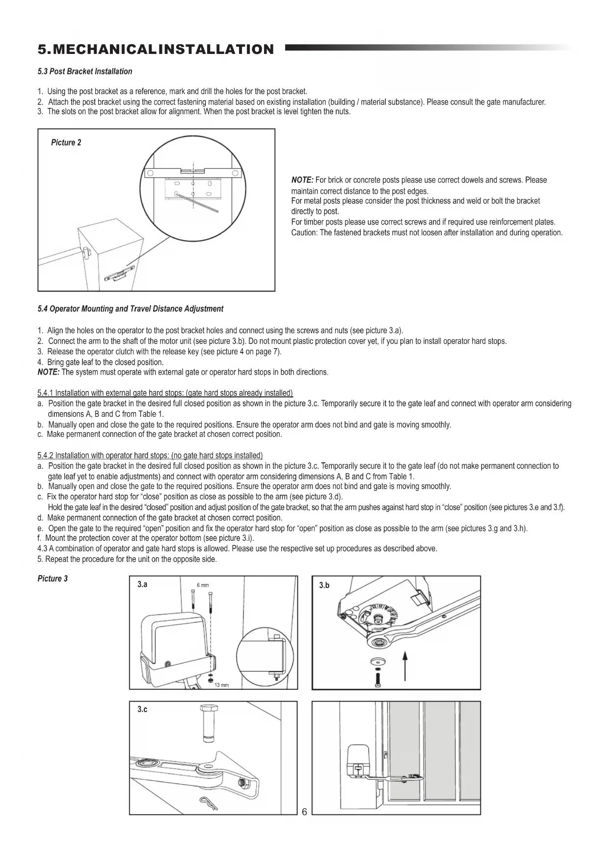 NOTE: For brick or concrete posts please use correct dowels and screws. Please maintain correct distance to the post edges. For metal posts please consider the post thickness and weld or bolt the bracket directly to post. For timber posts please use correct screws and if required use reinforcement plates. Caution: The fastened brackets must not loosen after installation and during operation. Picture 2 3.a 3.b 13 mm 6 mm 3.c