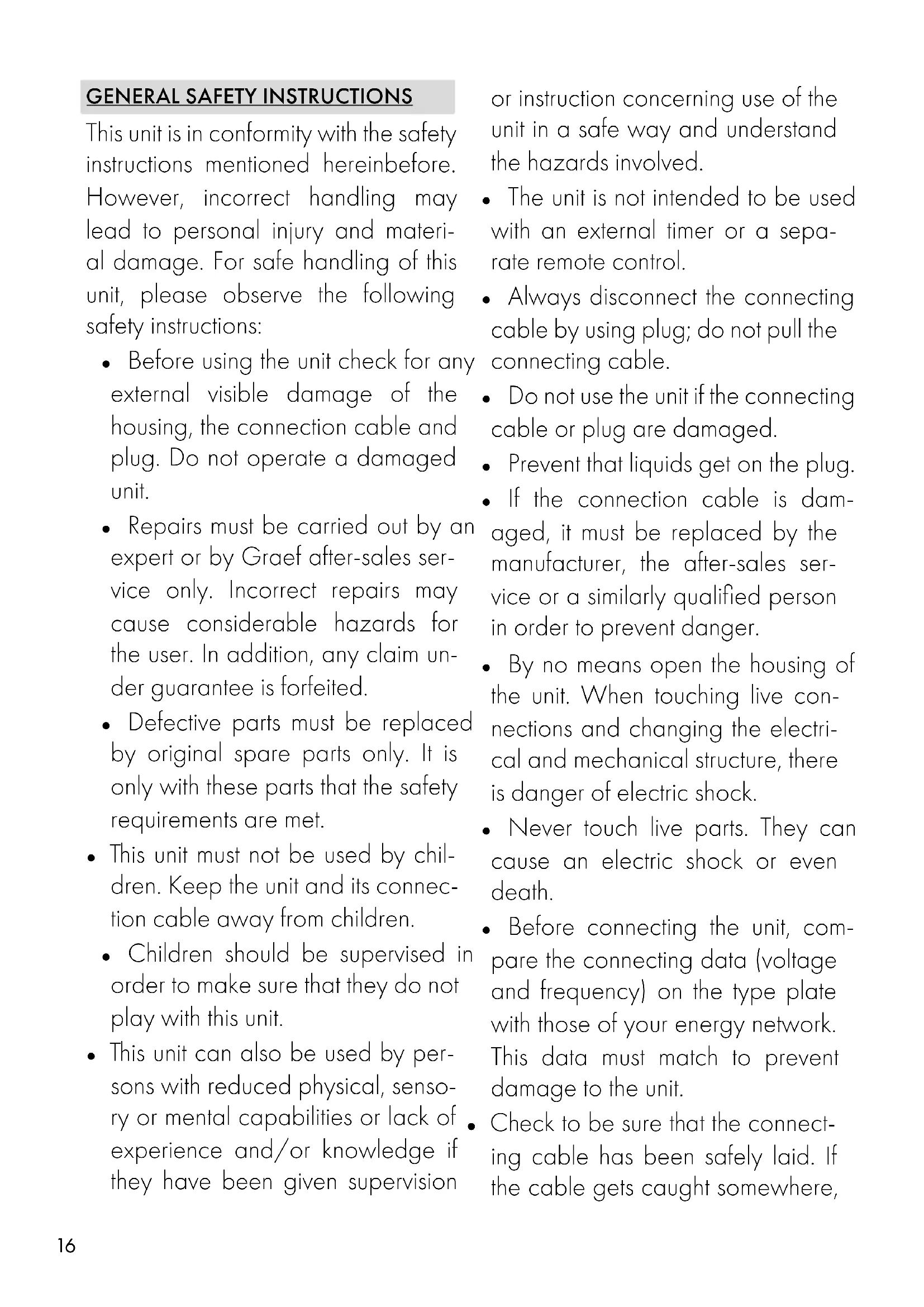 This unit is in conformity with the safety instructions mentioned hereinbefore. However, incorrect handling may lead to personal injury and materi- al damage. For safe handling of this unit, please observe the following safety instructions: ● Before using the unit check for any external visible damage of the housing, the connection cable and plug. Do not operate a damaged unit. ● Repairs must be carried out by an expert or by Graef after-sales ser- vice only. Incorrect repairs may cause considerable hazards for the user. In addition, any claim un- der guarantee is forfeited. ● Defective parts must be replaced by original spare parts only. It is only with these parts that the safety requirements are met. ● This unit must not be used by chil- dren. Keep the unit and its connec- tion cable away from children. ● Children should be supervised in order to make sure that they do not play with this unit. ● This unit can also be used by per- sons with reduced physical, senso- ry or mental capabilities or lack of experience and/or knowledge if they have been given supervision or instruction concerning use of the unit in a safe way and understand the hazards involved. ● The unit is not intended to be used with an external timer or a sepa- rate remote control. ● Always disconnect the connecting cable by using plug; do not pull the connecting cable. ● Do not use the unit if the connecting cable or plug are damaged. ● Prevent that liquids get on the plug. ● If the connection cable is dam- aged, it must be replaced by the manufacturer, the after-sales ser- vice or a similarly qualified person in order to prevent danger. ● By no means open the housing of the unit. When touching live con- nections and changing the electri- cal and mechanical structure, there is danger of electric shock. ● Never touch live parts. They can cause an electric shock or even death. ● Before connecting the unit, com- pare the connecting data (voltage and frequency) on the type plate with those of your energy network. This data must match to prevent damage to the unit. ● Check to be sure that the connect- ing cable has been safely laid. If the cable gets caught somewhere,17