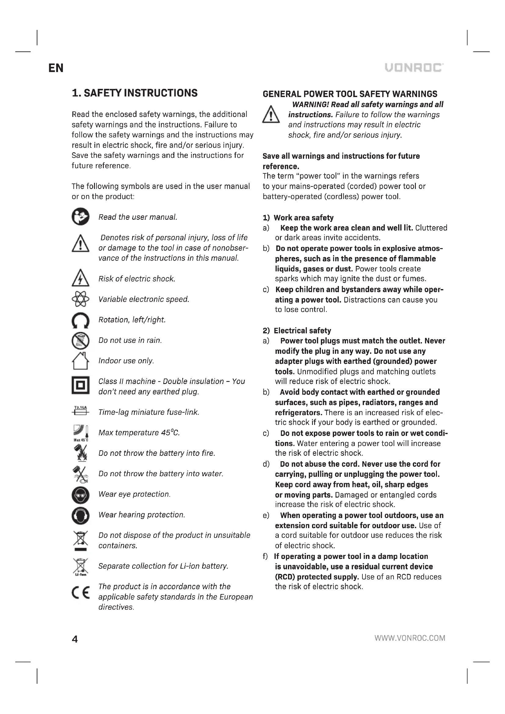 Read the enclosed safety warnings, the additional safety warnings and the instructions. Failure to follow the safety warnings and the instructions may result in electric shock, fire and/or serious injury. Save the safety warnings and the instructions for future reference. The following symbols are used in the user manual or on the product: Read the user manual. Denotes risk of personal injury, loss of life or damage to the tool in case of nonobser- vance of the instructions in this manual. Risk of electric shock. Variable electronic speed. Rotation, left/right. Do not use in rain. Indoor use only. Class II machine - Double insulation – You don’t need any earthed plug. Time-lag miniature fuse-link. Max temperature 45⁰C. Do not throw the battery into fire. Do not throw the battery into water. Wear eye protection. Wear hearing protection. Do not dispose of the product in unsuitable containers. Separate collection for Li-ion battery. The product is in accordance with the applicable safety standards in the European directives.