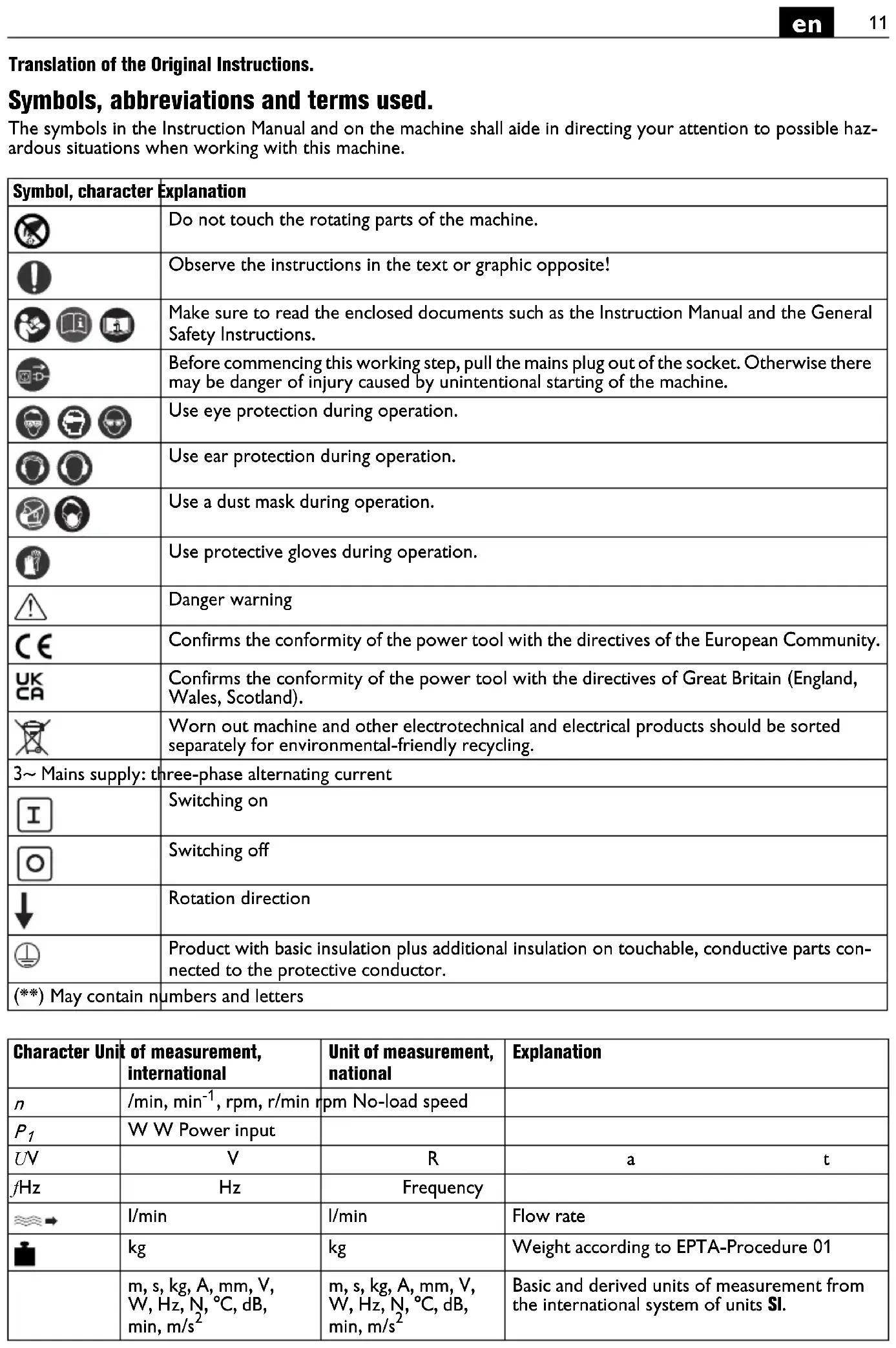 Translation of the Original Instructions. Symbols, abbreviations and terms used. The symbols in the Instruction Manual and on the machine shall aide in directing your attention to possible haz- ardous situations when working with this machine. Symbol, character Explanation Do not touch the rotating parts of the machine. Observe the instructions in the text or graphic opposite! Make sure to read the enclosed documents such as the Instruction Manual and the General Safety Instructions. Before commencing this working step, pull the mains plug out of the socket. Otherwise there may be danger of injury caused by unintentional starting of the machine. Use eye protection during operation. Use ear protection during operation. Use a dust mask during operation. Use protective gloves during operation. Danger warning Confirms the conformity of the power tool with the directives of the European Community. Confirms the conformity of the power tool with the directives of Great Britain (England, Wales, Scotland). Worn out machine and other electrotechnical and electrical products should be sorted separately for environmental-friendly recycling. 3~ Mains supply: three-phase alternating current Switching on Switching off Rotation direction Product with basic insulation plus additional insulation on touchable, conductive parts con- nected to the protective conductor. (**) May contain numbers and letters Character Unit of measurement, international Unit of measurement, national Explanation