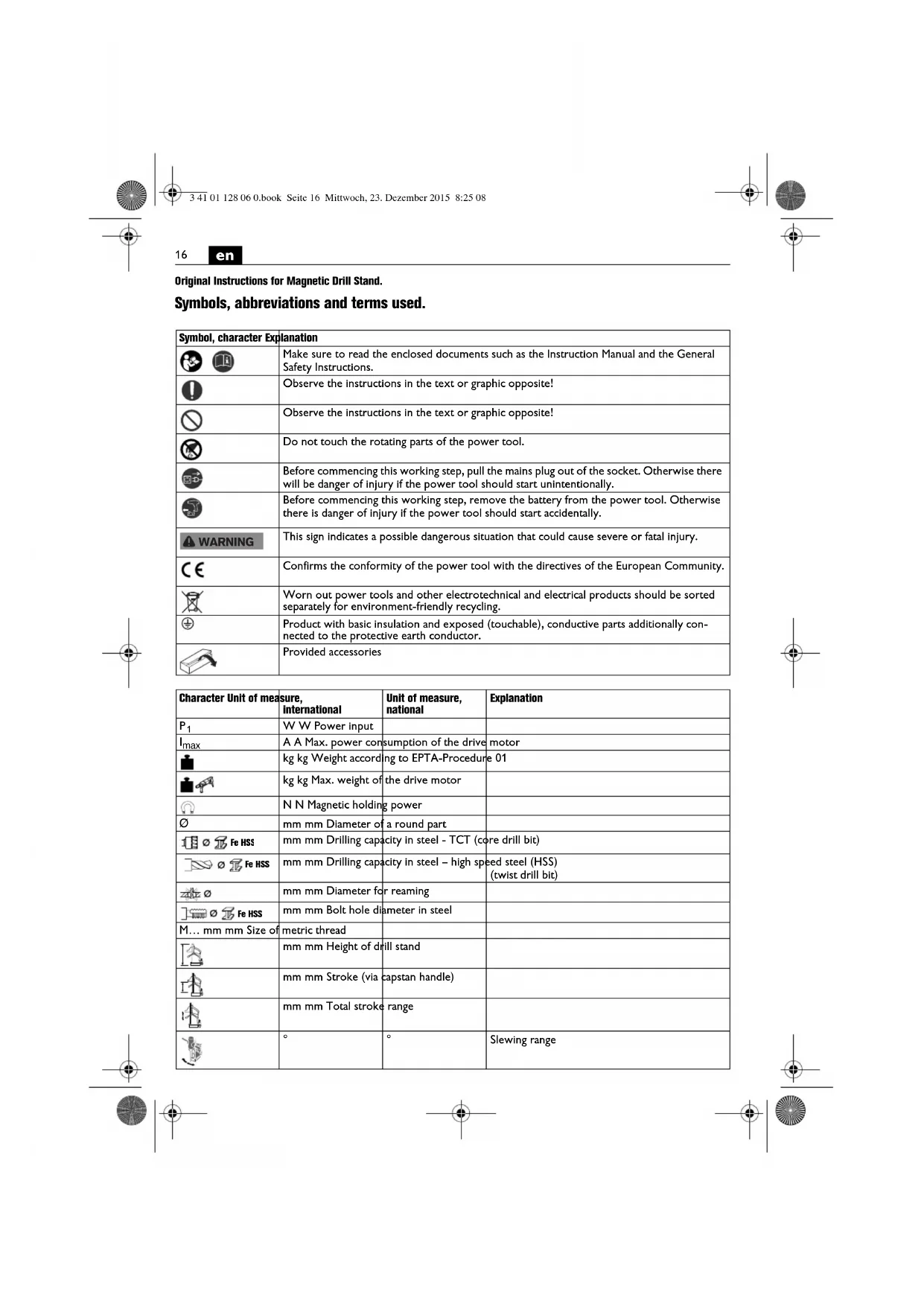 Original Instructions for Magnetic Drill Stand. Symbols, abbreviations and terms used. Symbol, character Explanation Make sure to read the enclosed documents such as the Instruction Manual and the General Safety Instructions. Observe the instructions in the text or graphic opposite! Observe the instructions in the text or graphic opposite! Do not touch the rotating parts of the power tool. Before commencing this working step, pull the mains plug out of the socket. Otherwise there will be danger of injury if the power tool should start unintentionally. Before commencing this working step, remove the battery from the power tool. Otherwise there is danger of injury if the power tool should start accidentally. This sign indicates a possible dangerous situation that could cause severe or fatal injury. Confirms the conformity of the power tool with the directives of the European Community. Worn out power tools and other electrotechnical and electrical products should be sorted separately for environment-friendly recycling. Product with basic insulation and exposed (touchable), conductive parts additionally con- nected to the protective earth conductor. Provided accessories Character Unit of measure, international Unit of measure, national Explanation