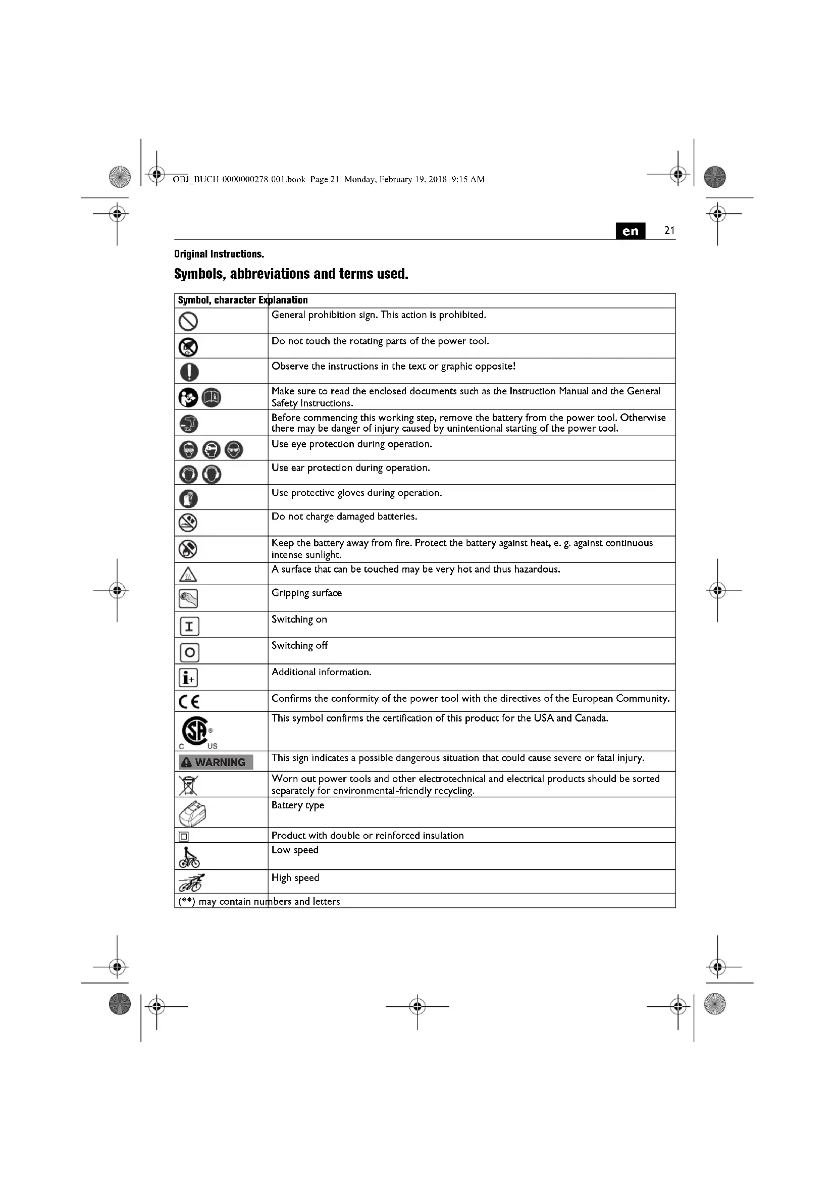 Original Instructions. Symbols, abbreviations and terms used. Symbol, character Explanation General prohibition sign. This action is prohibited. Do not touch the rotating parts of the power tool. Observe the instructions in the text or graphic opposite! Make sure to read the enclosed documents such as the Instruction Manual and the General Safety Instructions. Before commencing this working step, remove the battery from the power tool. Otherwise there may be danger of injury caused by unintentional starting of the power tool. Use eye protection during operation. Use ear protection during operation. Use protective gloves during operation. Do not charge damaged batteries. Keep the battery away from fire. Protect the battery against heat, e. g. against continuous intense sunlight. A surface that can be touched may be very hot and thus hazardous. Gripping surface Switching on Switching off Additional information. Confirms the conformity of the power tool with the directives of the European Community. This symbol confirms the certification of this product for the USA and Canada. This sign indicates a possible dangerous situation that could cause severe or fatal injury. Worn out power tools and other electrotechnical and electrical products should be sorted separately for environmental-friendly recycling. Battery type Product with double or reinforced insulation Low speed High speed (**) may contain numbers and letters WARNING OBJ_BUCH-0000000278-001.book Page 21 Monday, February 19, 2018 9:15 AM22