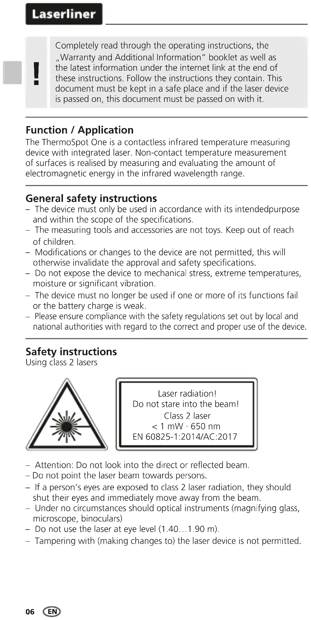Please ensure compliance with the safety regulations set out by local and national authorities with regard to the correct and proper use of the device. Completely read through the operating instructions, the „Warranty and Additional Information“ booklet as well as the latest information under the internet link at the end of these instructions. Follow the instructions they contain. This document must be kept in a safe place and if the laser device is passed on, this document must be passed on with it.