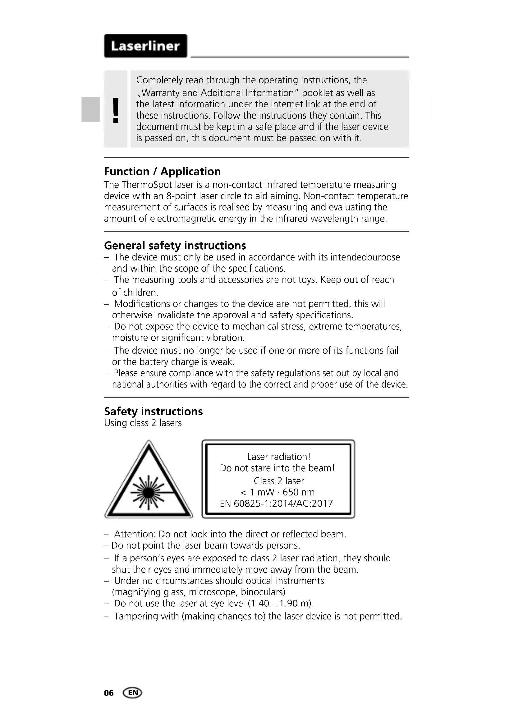 Please ensure compliance with the safety regulations set out by local and national authorities with regard to the correct and proper use of the device. Completely read through the operating instructions, the „Warranty and Additional Information“ booklet as well as the latest information under the internet link at the end of these instructions. Follow the instructions they contain. This document must be kept in a safe place and if the laser device is passed on, this document must be passed on with it.