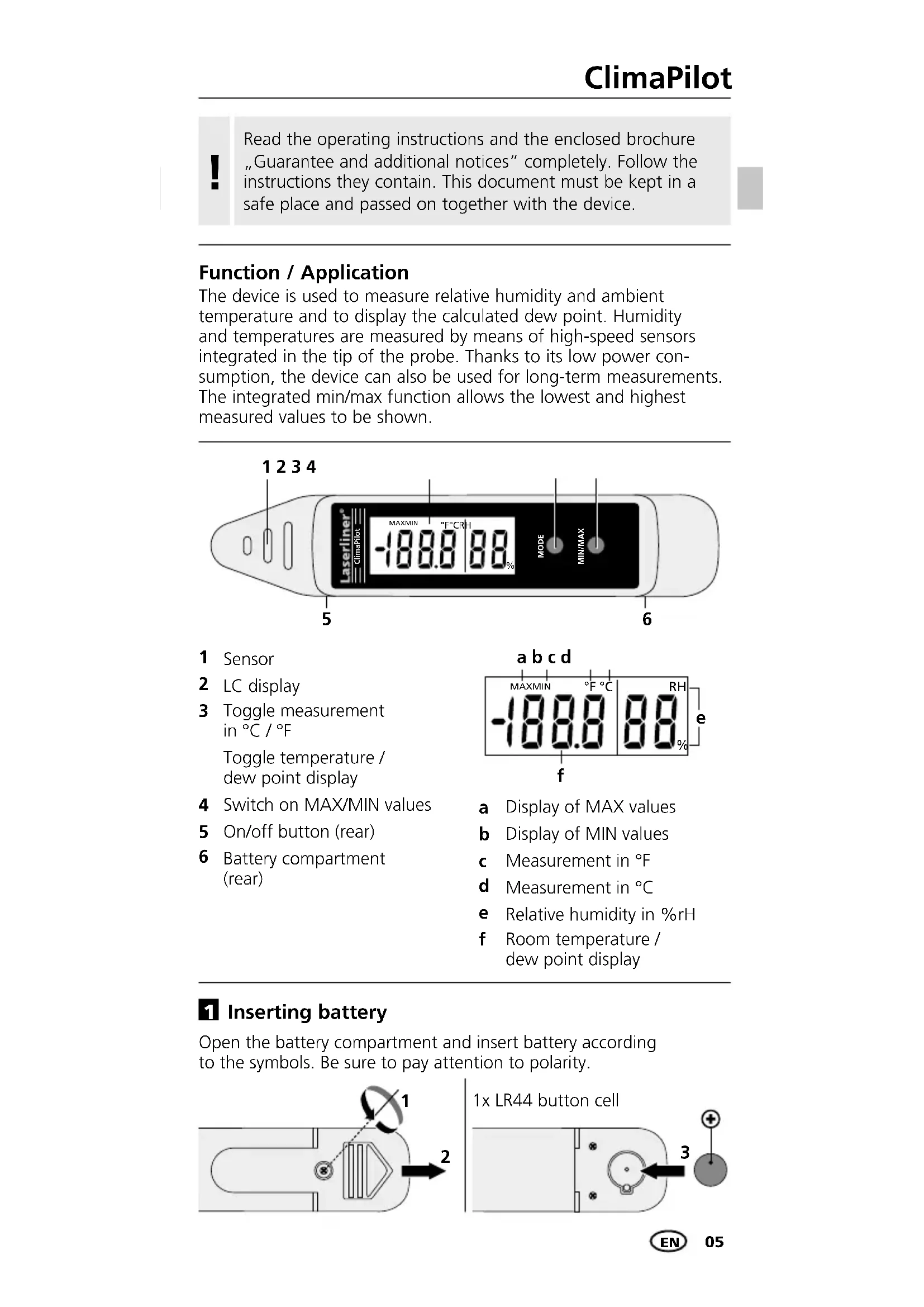 ON / OFF To turn on, set the switch (5) to ON. The device displays the ambient temperature and relative humidity. °C / °F To set the desired temperature unit, press and hold the „MODE“ button for 2 seconds until the corresponding symbol appears on the display. MAX / MIN Dew point display To determine the maximum or minimum measured values during a measurement, press and hold the „MAX / MIN“ button until either „MAX“ or „MIN“ appear on the display. The normal measuring mode is set when no function ashes on the display. By briey pressing the „MODE“ button, the measured dew point is displayed. Notes – This product is a precision instrument which must be handled with care. Avoid impact and vibration as well as exposure to extreme heat or cold. – Avoid direct contact with liquids. – Clean with a soft, damp cloth.ClimaPilot