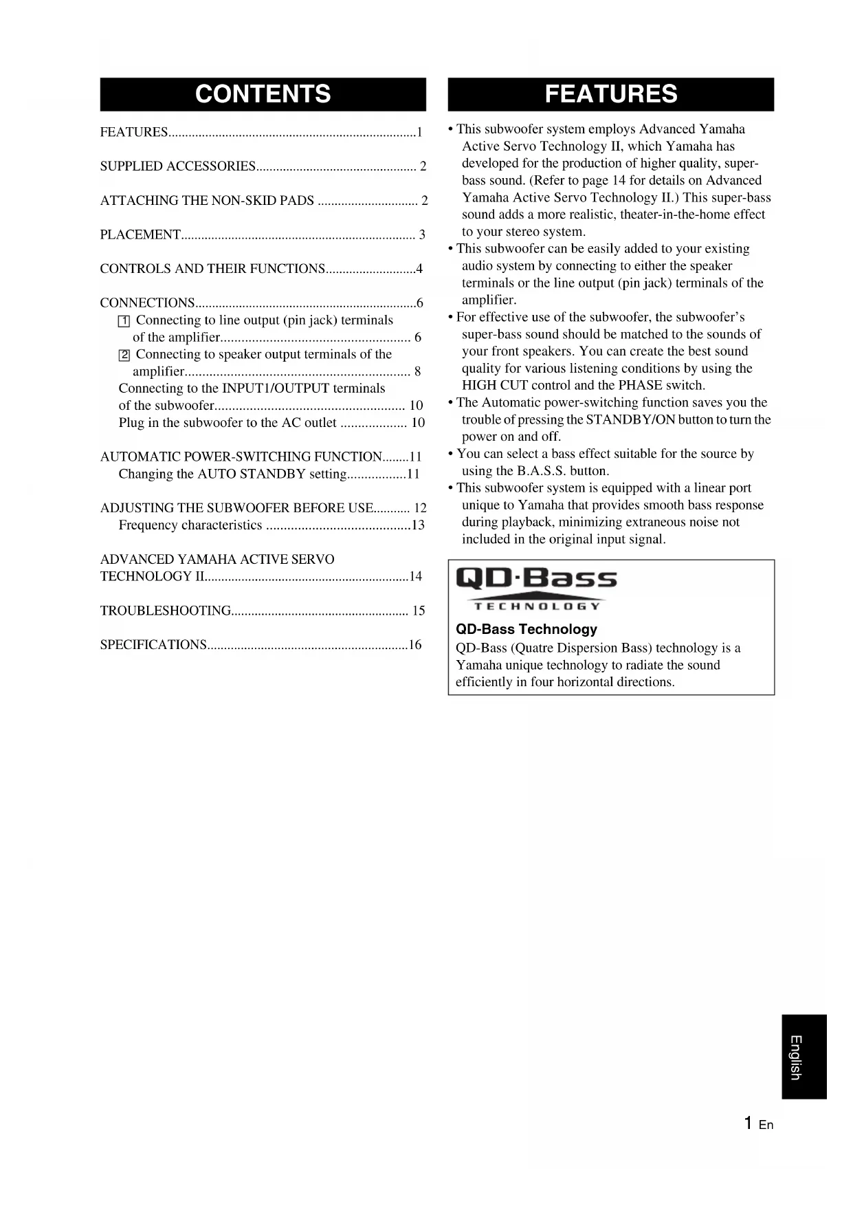 FEATURES QD-Bass Technology QD-Bass (Quatre Dispersion Bass) technology is a Yamaha unique technology to radiate the sound efficiently in four horizontal directions.2 En After unpacking, check that the following parts are contained. To enjoy the high sound quality, stabilize the subwoofer using the non-skid pads. Attach the provided non-skid pads in the four corners of the underside of the subwoofer to prevent the subwoofer from moving as a result of vibration, etc. SUPPLIED ACCESSORIES