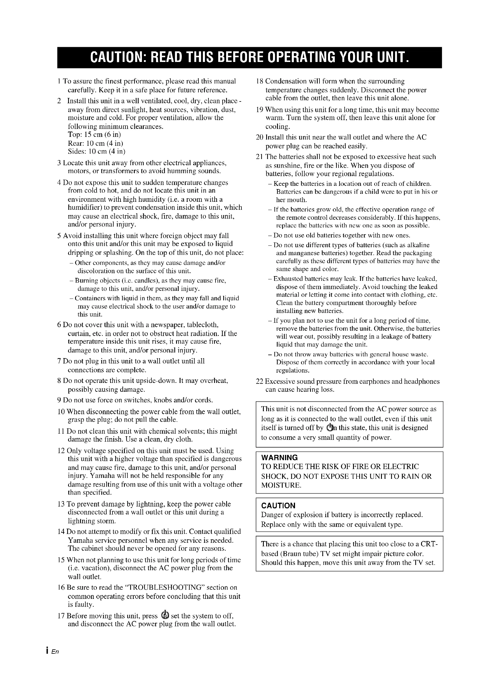 TSX-B232 Gi En 1 To assure the finest performance, please read this manual carefully. Keep it in a safe place for future reference. 2 Install this unit in a well ventilated, cool, dry, clean place - away from direct sunlight, heat sources, vibration, dust, moisture and cold. For proper ventilation, allow the following minimum clearances. Top: 15 cm (6 in) Rear: 10 cm (4 in) Sides: 10 cm (4 in) 3 Locate this unit away from other electrical appliances, motors, or transformers to avoid humming sounds. 4 Do not expose this unit to sudden temperature changes from cold to hot, and do not locate this unit in an environment with high humidity (i.e. a room with a humidifier) to prevent condensation inside this unit, which may cause an electrical shock, fire, damage to this unit, and/or personal injury. 5 Avoid installing this unit where foreign object may fall onto this unit and/or this unit may be exposed to liquid dripping or splashing. On the top of this unit, do not place: – Other components, as they may cause damage and/or discoloration on the surface of this unit. – Burning objects (i.e. candles), as they may cause fire, damage to this unit, and/or personal injury. – Containers with liquid in them, as they may fall and liquid may cause electrical shock to the user and/or damage to this unit. 6 Do not cover this unit with a newspaper, tablecloth, curtain, etc. in order not to obstruct heat radiation. If the temperature inside this unit rises, it may cause fire, damage to this unit, and/or personal injury. 7 Do not plug in this unit to a wall outlet until all connections are complete. 8 Do not operate this unit upside-down. It may overheat, possibly causing damage. 9 Do not use force on switches, knobs and/or cords. 10 When disconnecting the power cable from the wall outlet, grasp the plug; do not pull the cable. 11 Do not clean this unit with chemical solvents; this might damage the finish. Use a clean, dry cloth. 12 Only voltage specified on this unit must be used. Using this unit with a higher voltage than specified is dangerous and may cause fire, damage to this unit, and/or personal injury. Yamaha will not be held responsible for any damage resulting from use of this unit with a voltage other than specified. 13 To prevent damage by lightning, keep the power cable disconnected from a wall outlet or this unit during a lightning storm. 14 Do not attempt to modify or fix this unit. Contact qualified Yamaha service personnel when any service is needed. The cabinet should never be opened for any reasons. 15 When not planning to use this unit for long periods of time (i.e. vacation), disconnect the AC power plug from the wall outlet. 16 Be sure to read the “TROUBLESHOOTING” section on common operating errors before concluding that this unit is faulty. 17 Before moving this unit, press to set the system to off, and disconnect the AC power plug from the wall outlet. 18 Condensation will form when the surrounding temperature changes suddenly. Disconnect the power cable from the outlet, then leave this unit alone. 19 When using this unit for a long time, this unit may become warm. Turn the system off, then leave this unit alone for cooling. 20 Install this unit near the wall outlet and where the AC power plug can be reached easily. 21 The batteries shall not be exposed to excessive heat such as sunshine, fire or the like. When you dispose of batteries, follow your regional regulations. – Keep the batteries in a location out of reach of children. Batteries can be dangerous if a child were to put in his or her mouth. – If the batteries grow old, the effective operation range of the remote control decreases considerably. If this happens, replace the batteries with new one as soon as possible. – Do not use old batteries together with new ones. – Do not use different types of batteries (such as alkaline and manganese batteries) together. Read the packaging carefully as these different types of batteries may have the same shape and color. – Exhausted batteries may leak. If the batteries have leaked, dispose of them immediately. Avoid touching the leaked material or letting it come into contact with clothing, etc. Clean the battery compartment thoroughly before installing new batteries. – If you plan not to use the unit for a long period of time, remove the batteries from the unit. Otherwise, the batteries will wear out, possibly resulting in a leakage of battery liquid that may damage the unit. – Do not throw away batteries with general house waste. Dispose of them correctly in accordance with your local regulations. 22 Excessive sound pressure from earphones and headphones can cause hearing loss. CAUTION: READ THIS BEFORE OPERATING YOUR UNIT. This unit is not disconnected from the AC power source as long as it is connected to the wall outlet, even if this unit itself is turned off by . In this state, this unit is designed to consume a very small quantity of power. WARNING TO REDUCE THE RISK OF FIRE OR ELECTRIC SHOCK, DO NOT EXPOSE THIS UNIT TO RAIN OR MOISTURE. CAUTION Danger of explosion if battery is incorrectly replaced. Replace only with the same or equivalent type. There is a chance that placing this unit too close to a CRT- based (Braun tube) TV set might impair picture color. Should this happen, move this unit away from the TV set.1 En English