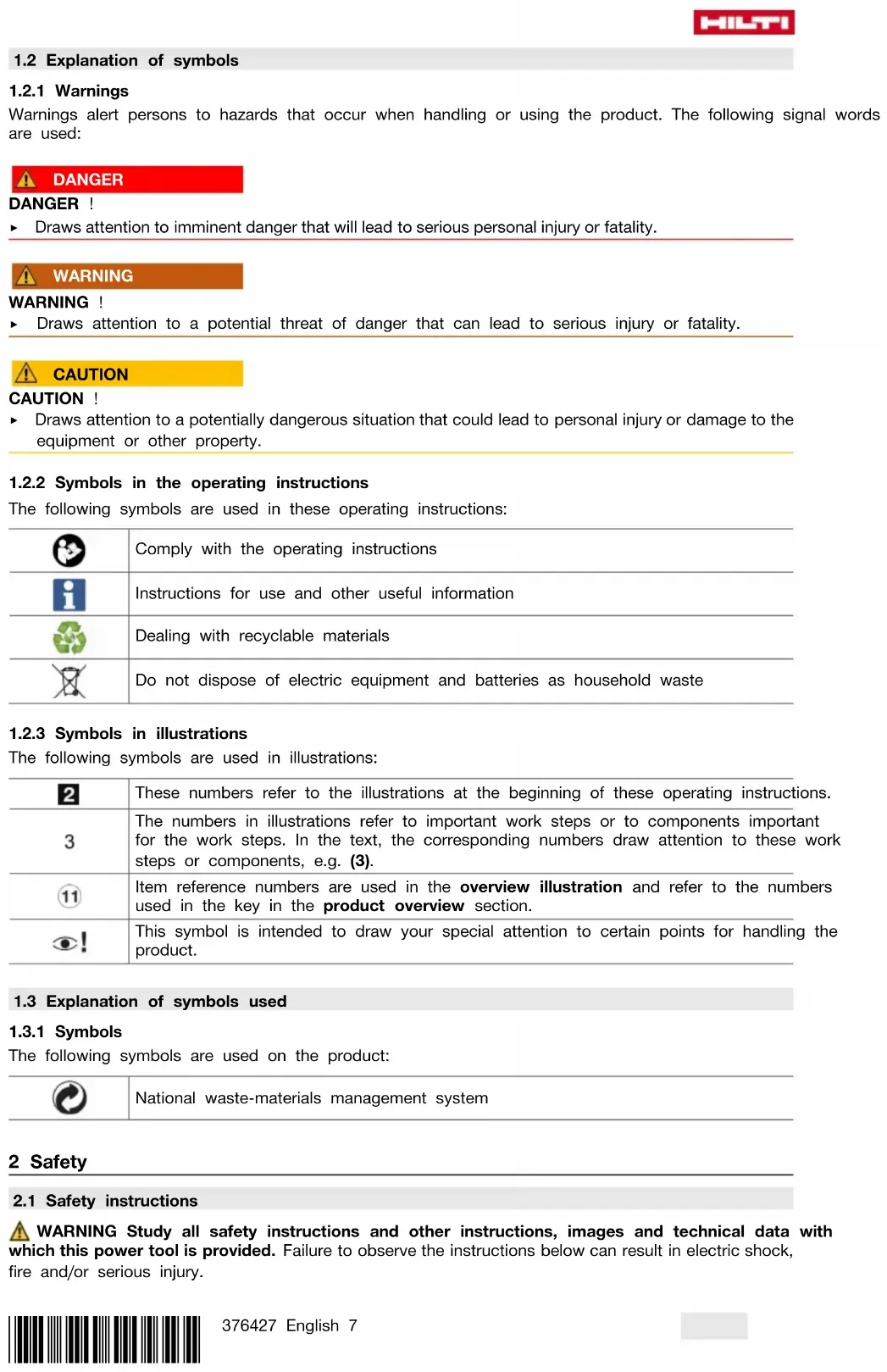 - Ensure that these operating instructions are with the product when it is given to other persons.*376427* 376427 English 7