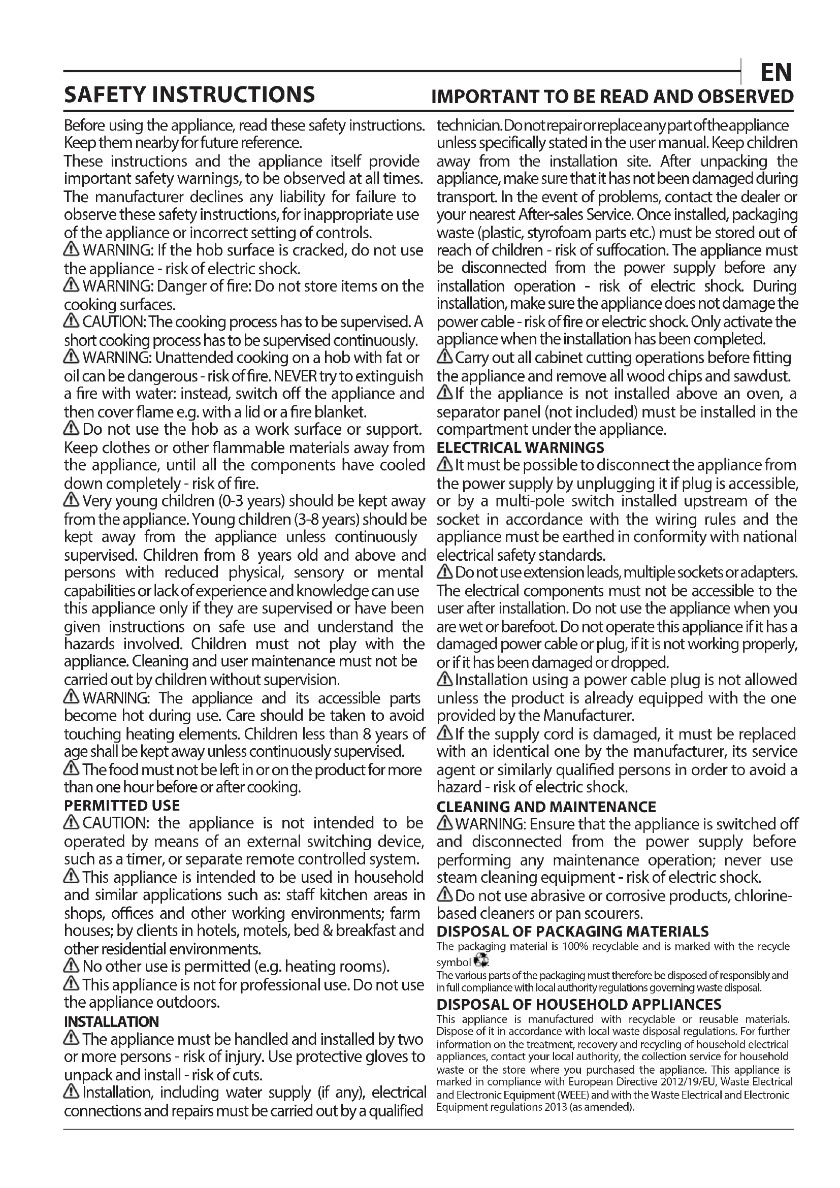 become hot during use. Care should be taken to avoid touching heating elements. Children less than 8 years of age shall be kept away unless continuously supervised. The food must not be left in or on the product for more than one hour before or after cooking. PERMITTED USE CAUTION: the appliance is not intended to be operated by means of an external switching device, such as a timer, or separate remote controlled system. This appliance is intended to be used in household and similar applications such as: sta kitchen areas in shops, oces and other working environments; farm houses; by clients in hotels, motels, bed & breakfast and other residential environments. No other use is permitted (e.g. heating rooms). This appliance is not for professional use. Do not use the appliance outdoors. INSTALLATION The appliance must be handled and installed by two or more persons - risk of injury. Use protective gloves to unpack and install - risk of cuts. Installation, including water supply (if any), electrical connections and repairs must be carried out by a qualified technician. Do not repair or replace any part of the appliance unless specifically stated in the user manual. Keep children away from the installation site. After unpacking the appliance, make sure that it has not been damaged during transport. In the event of problems, contact the dealer or your nearest After-sales Service. Once installed, packaging waste (plastic, styrofoam parts etc.) must be stored out of reach of children - risk of suffocation. The appliance must be disconnected from the power supply before any installation operation - risk of electric shock. During installation, make sure the appliance does not damage the power cable - risk of fire or electric shock. Only activate the appliance when the installation has been completed. Carry out all cabinet cutting operations before tting the appliance and remove all wood chips and sawdust. If the appliance is not installed above an oven, a separator panel (not included) must be installed in the compartment under the appliance. ELECTRICAL WARNINGS It must be possible to disconnect the appliance from the power supply by unplugging it if plug is accessible, or by a multi-pole switch installed upstream of the socket in accordance with the wiring rules and the appliance must be earthed in conformity with national electrical safety standards. Do not use extension leads, multiple sockets or adapters. The electrical components must not be accessible to the user after installation. Do not use the appliance when you are wet or barefoot. Do not operate this appliance if it has a damaged power cable or plug, if it is not working properly, or if it has been damaged or dropped. Installation using a power cable plug is not allowed unless the product is already equipped with the one provided by the Manufacturer. If the supply cord is damaged, it must be replaced with an identical one by the manufacturer, its service agent or similarly qualied persons in order to avoid a hazard - risk of electric shock.