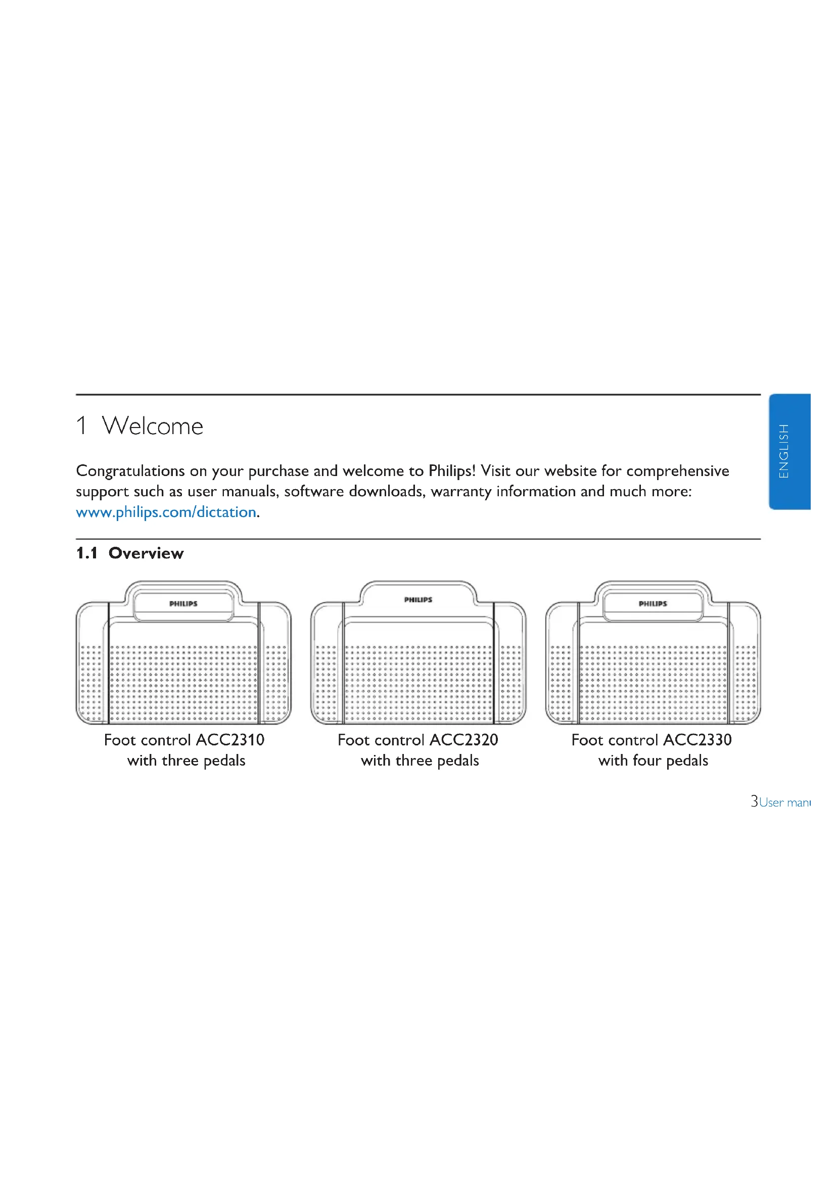 Press and release the top pedal to finish a dictation. E Tip If the middle pedal has been disabled with Philips SpeechControl software (see next chapter), it can be secured with the switch on the underside of the foot control. Model: ACC2330/00 S/N: 000000 KW: 540 Made in Hungary10 User manual 5 Advanced configuration Use the Philips SpeechControl software to change the pedal functions of the foot control. 1 Connect the foot control to a free USB port on the PC. 2 Start Philips SpeechControl software. 3 Change the function of the pedals according to your preferences.