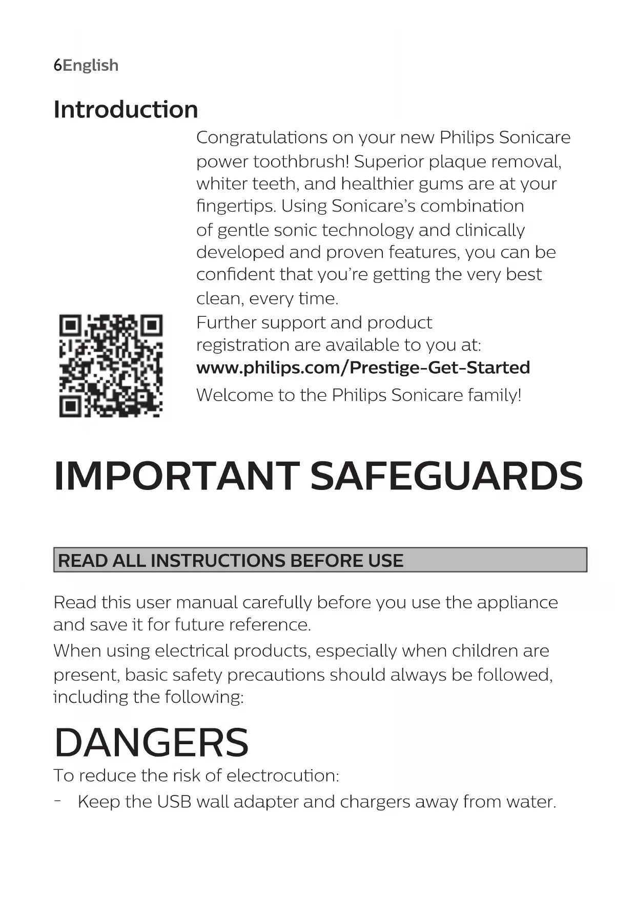 idml_export_757_72.indd 3idml_export_757_72.indd 3 08-02-21 14:0408-02-21 14:04empty page before TOC idml_export_757_72.indd 4idml_export_757_72.indd 4 08-02-21 14:0408-02-21 14:04English 6 Español 33 Français (Canada) 62 idml_export_757_72.indd 5idml_export_757_72.indd 5 08-02-21 14:0408-02-21 14:04English 6 English Introduction Congratulations on your new Philips Sonicare power toothbrush! Superior plaque removal, whiter teeth, and healthier gums are at your ngertips. Using Sonicare’s combination of gentle sonic technology and clinically developed and proven features, you can be condent that you’re getting the very best clean, every time. Further support and product registration are available to you at: www.philips.com/Prestige-Get-Started Welcome to the Philips Sonicare family! IMPORTANT SAFEGUARDS