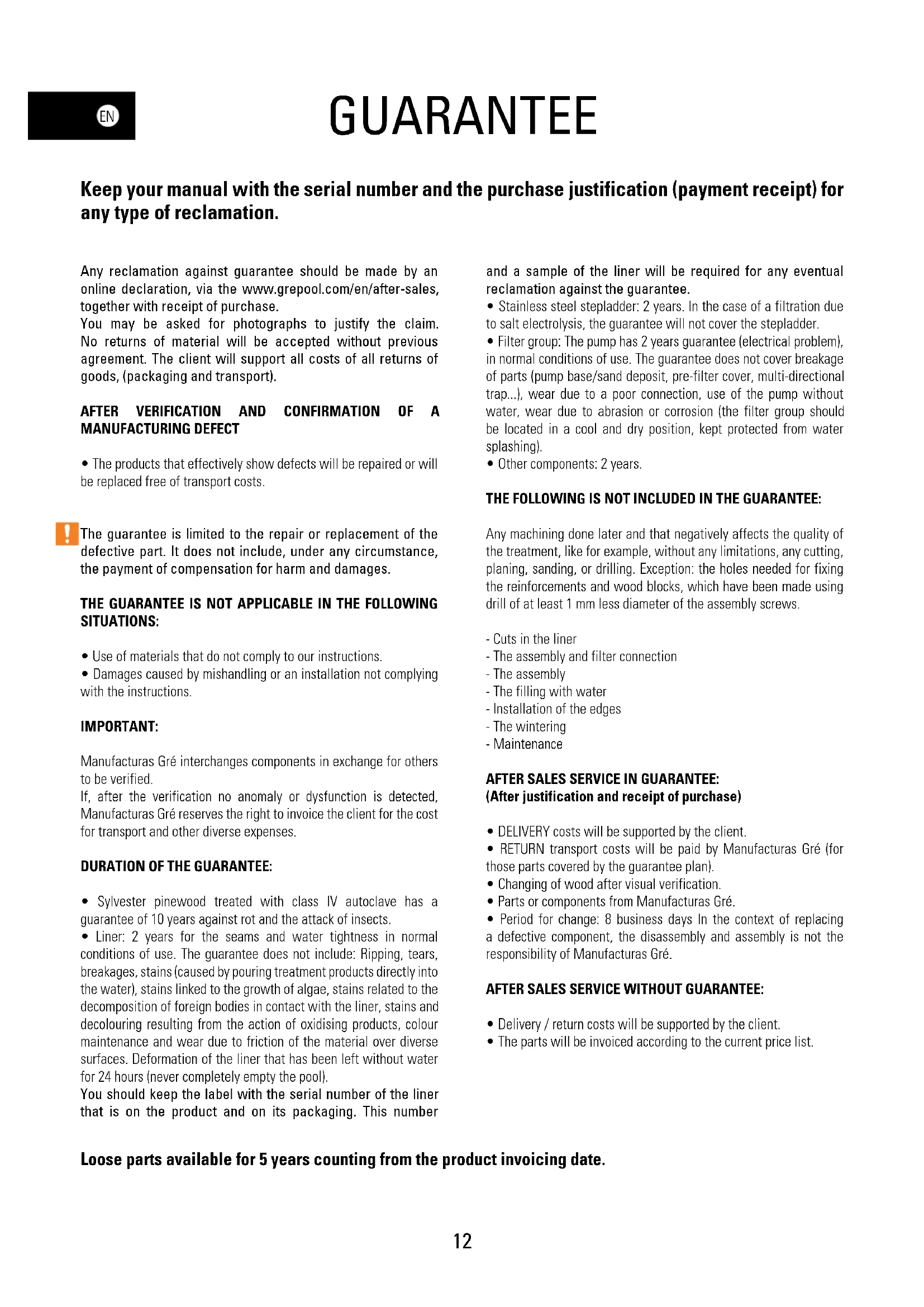 - Other components: 2 years. THE FOLLOWING IS NOT INCLUDED IN THE GUARANTEE: Any machining done later and that negatively affects the quality of the treatment, like for example, without any limitations, any cutting, planing, sanding, or drilling. Exception: the holes needed for fixing the reinforcements and wood blocks, which have been made using drill of at least 1 mm less diameter of the assembly screws. - Cuts in the liner - The assembly and filter connection - The assembly - The filling with water - Installation of the edges - The wintering - Maintenance AFTER SALES SERVICE IN GUARANTEE: (After justification and receipt of purchase)