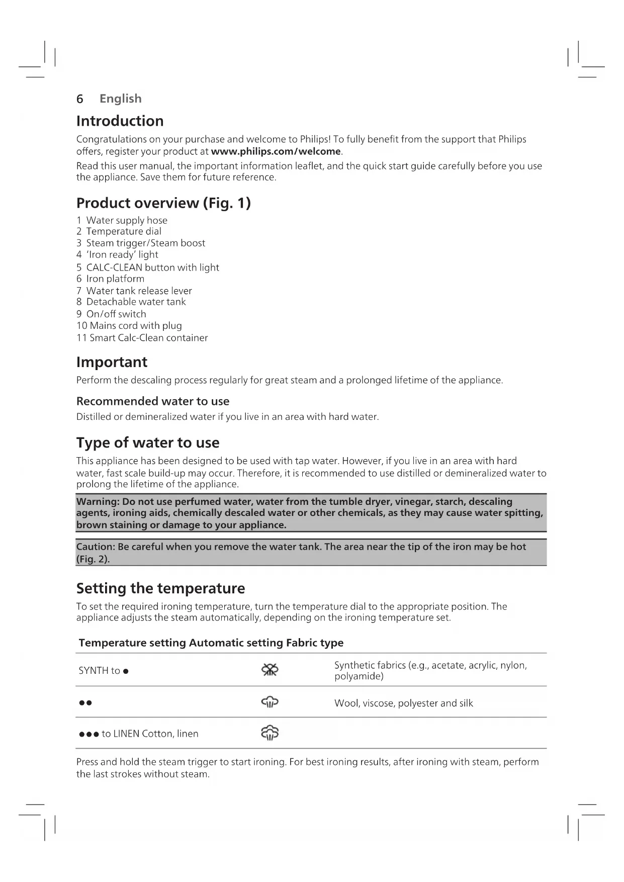 Caution: Do not interrupt the process by lifting the iron up from the Calc-Clean container, as hot water and steam will come out of the soleplate. 1 Fill up the water tank halfway )Fig. 4(. Note: Make sure that the appliance is plugged in and switched ON during the Calc-Clean process. 2 Place the Calc-Clean container on the ironing board or any other even, stable surface. 3 Place the iron stably on the Calc-Clean container )Fig. 5(. Note: The Calc-Clean container has been designed to collect scale particles and hot water during the Calc-Clean process. It is perfectly safe to rest the iron on this container during the entire process. 4 Press and hold the Calc-Clean button for 2 seconds until you hear short beeps )Fig. 6(. 5 During the Calc-Clean process, you hear short beeps and a pumping sound )Fig. 7(. 6 When the Calc-Clean process is completed, the iron stops beeping and the CALC-CLEAN light stops ashing )Fig. 8(. 7 Wipe the iron with a piece of cloth and put it back on the base station )Fig. 9(. 8 As the Calc-Clean container becomes hot during the Calc-Clean process, wait approx. 5 minutes before you touch it. Then carry the Calc-Clean container to the sink, empty it and store it for future use )Fig. 10(. 9 If necessary, you can repeat steps 1 to 7. Make sure that you empty the Calc-Clean container before you start the Calc-Clean process. Note: During the Calc-Clean process, clean water may come out of the soleplate if no scale has accumulated inside the iron. This is normal.8 English Troubleshooting This chapter summarizes the most common problems you could encounter with the appliance. If you are unable to solve the problem with the information below, visit www.philips.com/support for a list of frequently asked questions or contact the Consumer Care Center in your country. Problem Possible cause Solution The iron does not produce any steam. You have set the temperature dial to SYNTH to 1. Turn the temperature dial to 2 or higher. The steam function has been disabled until you have performed the Calc-Clean process. Perform the Calc-Clean process to restore the steam function )see chapter ‘Cleaning and maintenance’(. At the start of your ironing session, the steam trigger has not been pressed long enough. Press and hold the steam trigger until steam comes out. It may take up to 30 seconds until steam comes out. The Calc-Clean light ashes. No steam comes out of the soleplate and/ or the appliance beeps. You have not done or have not completed the Calc-Clean process. Perform the Calc-Clean process to enable the steam function again )see chapter ‘Cleaning and maintenance’(. The appliance has switched o. The auto shut-o function is activated automatically when the appliance has not been used for more than 5 minutes. To activate the appliance again, set the on/ o switch to ‘o’ position and then to ‘on’ position. The appliance then starts to heat up again. The appliance produces a loud pumping sound. The water tank is empty. Fill the water tank with water and press the steam trigger until the pumping sound becomes softer and steam comes out of the soleplate. Water droplets comes out of the soleplate. After the Calc-Clean process remaining water may drip out of the soleplate. Wipe the soleplate dry with a piece of cloth. If the Calc-Clean light still ashes and the appliance still beeps, perform the Calc- Clean process (see chapter ‘Cleaning and maintenance'(. Dirty water and impurities )brown stains, white akes, etc.( come out of the soleplate. Impurities or chemicals present in the water have deposited in the steam vents and/or soleplate. Performs the Calc-Clean process regularly )see chapter ‘Cleaning and maintenance'(. Water ushes out of the soleplate. You have accidentally started the Calc-Clean process (see chapter ‘Cleaning and maintenance'(. Switch o the appliance. Then switch it back on again. Let the iron heat up until the ‘iron ready' light lights up steadily.9 Dansk Introduktion Tillykke med dit køb og velkommen til Philips! Få alle fordele af den support, som Philips tilbyder, ved at registrere dit produkt på www.philips.com/welcome. Læs denne brugervejledning, folderen med vigtige oplysninger og lynhåndbogen omhyggeligt igennem, inden apparatet tages i brug. Gem dem til senere brug.
