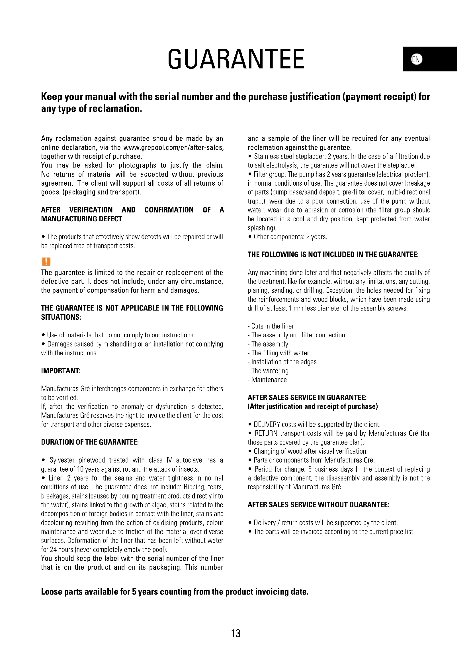 - Other components: 2 years. THE FOLLOWING IS NOT INCLUDED IN THE GUARANTEE: Any machining done later and that negatively affects the quality of the treatment, like for example, without any limitations, any cutting, planing, sanding, or drilling. Exception: the holes needed for fixing the reinforcements and wood blocks, which have been made using drill of at least 1 mm less diameter of the assembly screws. - Cuts in the liner - The assembly and filter connection - The assembly - The filling with water - Installation of the edges - The wintering - Maintenance AFTER SALES SERVICE IN GUARANTEE: (After justification and receipt of purchase)