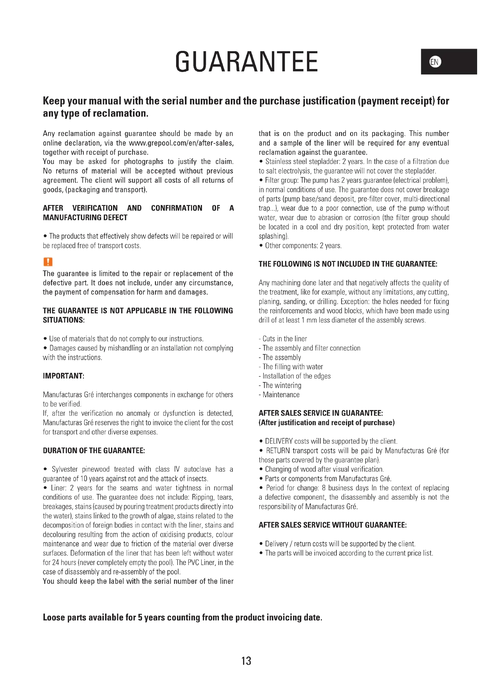 - Other components: 2 years. THE FOLLOWING IS NOT INCLUDED IN THE GUARANTEE: Any machining done later and that negatively affects the quality of the treatment, like for example, without any limitations, any cutting, planing, sanding, or drilling. Exception: the holes needed for fixing the reinforcements and wood blocks, which have been made using drill of at least 1 mm less diameter of the assembly screws. - Cuts in the liner - The assembly and filter connection - The assembly - The filling with water - Installation of the edges - The wintering - Maintenance AFTER SALES SERVICE IN GUARANTEE: (After justification and receipt of purchase)