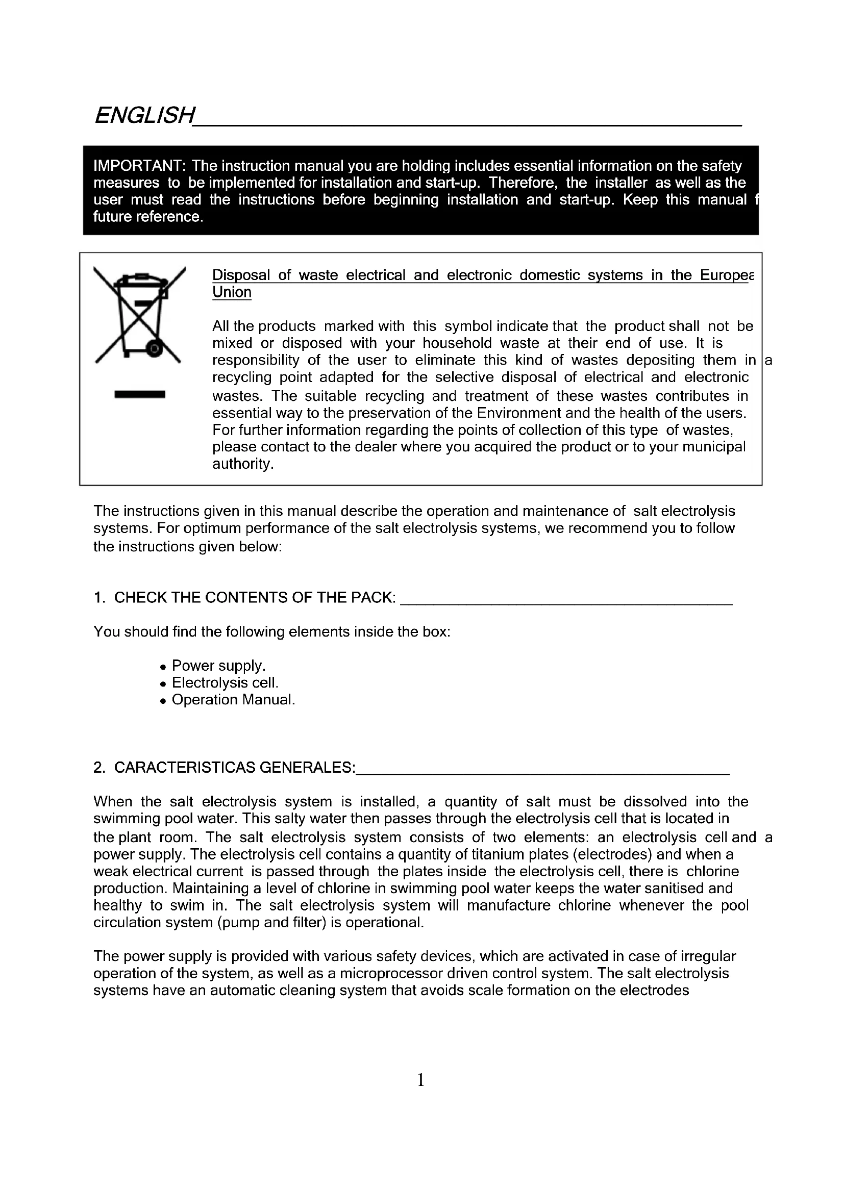 Disposal of waste electrical and electronic domestic systems in the European Union All the products marked with this symbol indicate that the product shall not be mixed or disposed with your household waste at their end of use. It is responsibility of the user to eliminate this kind of wastes depositing them in a recycling point adapted for the selective disposal of electrical and electronic wastes. The suitable recycling and treatment of these wastes contributes in essential way to the preservation of the Environment and the health of the users. For further information regarding the points of collection of this type of wastes, please contact to the dealer where you acquired the product or to your municipal authority. The instructions given in this manual describe the operation and maintenance of salt electrolysis systems. For optimum performance of the salt electrolysis systems, we recommend you to follow the instructions given below: