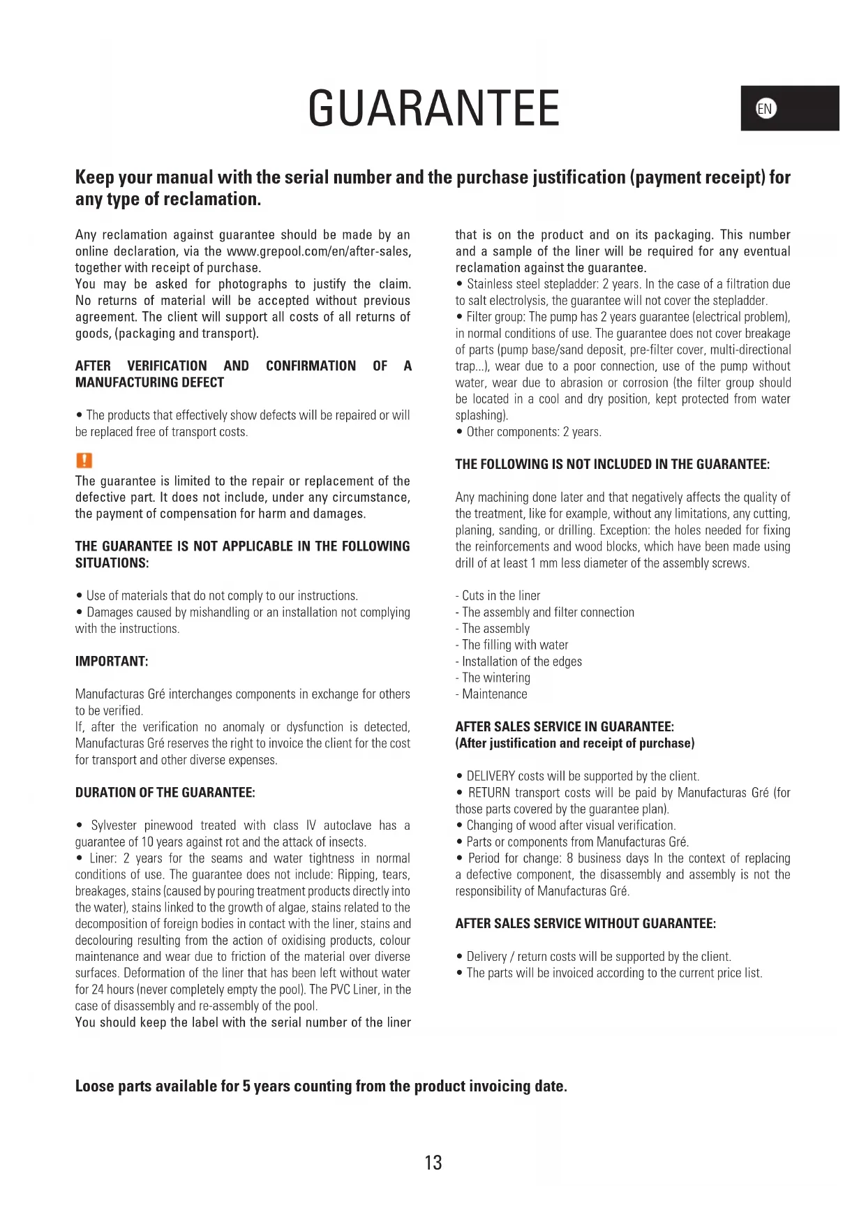 GUARANTEE Keep your manual with the serial number and the purchase justification (payment receipt) for any type of reclamation. Loose parts available for 5 years counting from the product invoicing date. Any reclamation against guarantee should be made by an online declaration, via the www.grepool.com/en/after-sales, together with receipt of purchase. You may be asked for photographs to justify the claim. No returns of material will be accepted without previous agreement. The client will support all costs of all returns of goods, (packaging and transport).