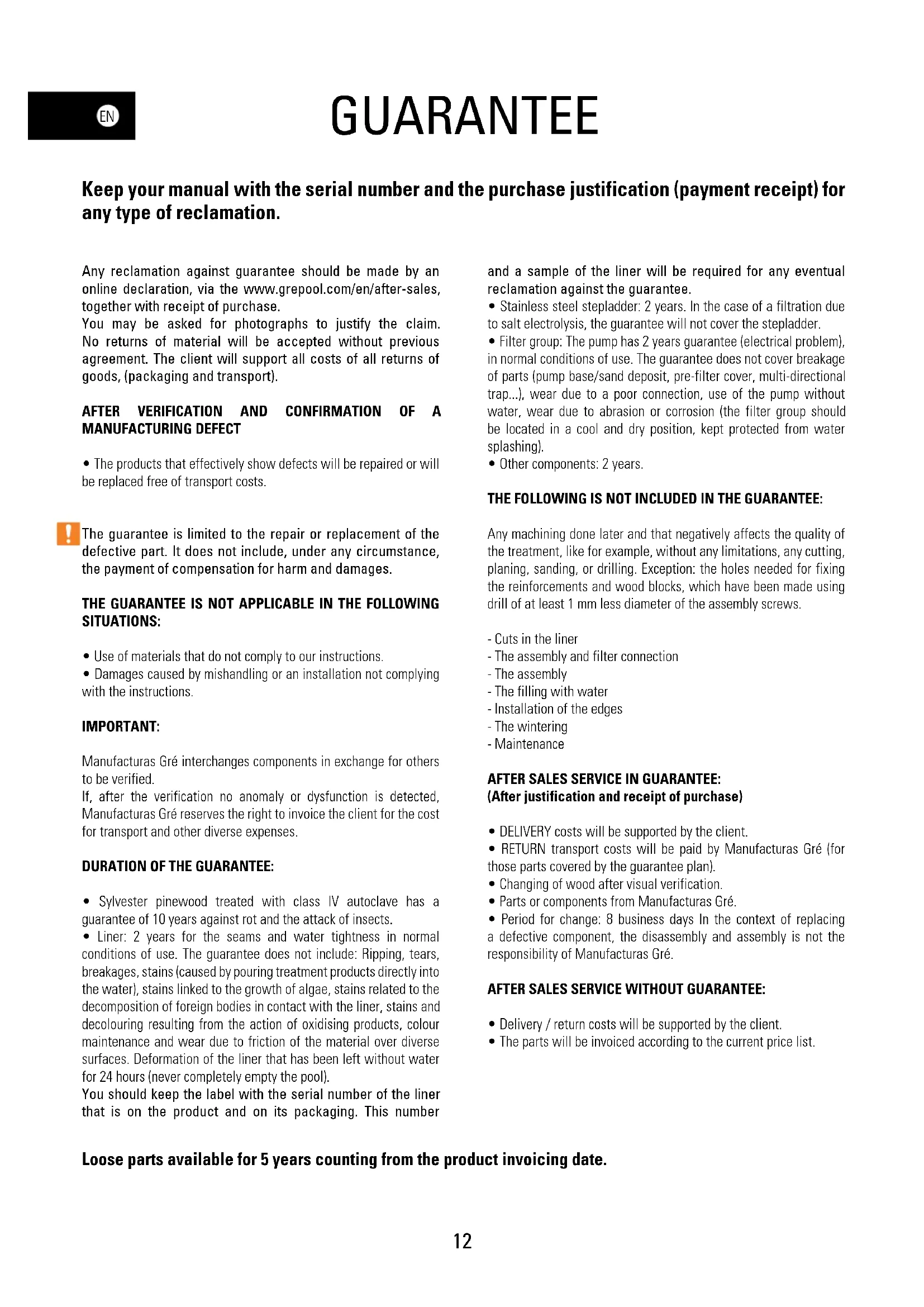 - Other components: 2 years. THE FOLLOWING IS NOT INCLUDED IN THE GUARANTEE: Any machining done later and that negatively affects the quality of the treatment, like for example, without any limitations, any cutting, planing, sanding, or drilling. Exception: the holes needed for fixing the reinforcements and wood blocks, which have been made using drill of at least 1 mm less diameter of the assembly screws. - Cuts in the liner - The assembly and filter connection - The assembly - The filling with water - Installation of the edges - The wintering - Maintenance AFTER SALES SERVICE IN GUARANTEE: (After justification and receipt of purchase)